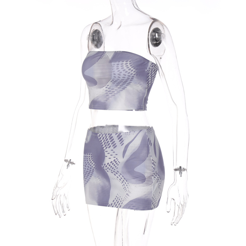 Abstrakter Druck auf Hals und Brust, Weste, enger, ultrakurzer Hüftrock, zweiteiliges Set