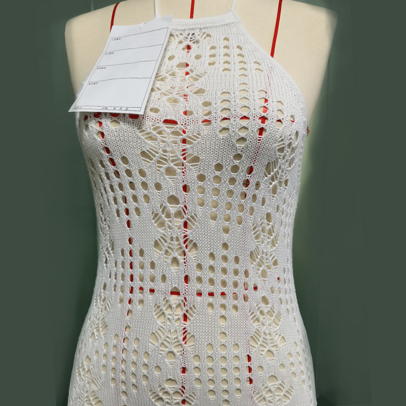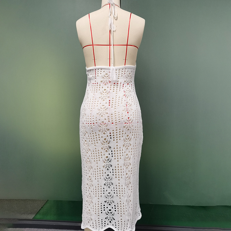 Strandkleid, einfarbig, gestrickt, ausgehöhlt, Strand-Bikini-Bluse, Sonnenschutz-Krawatte
