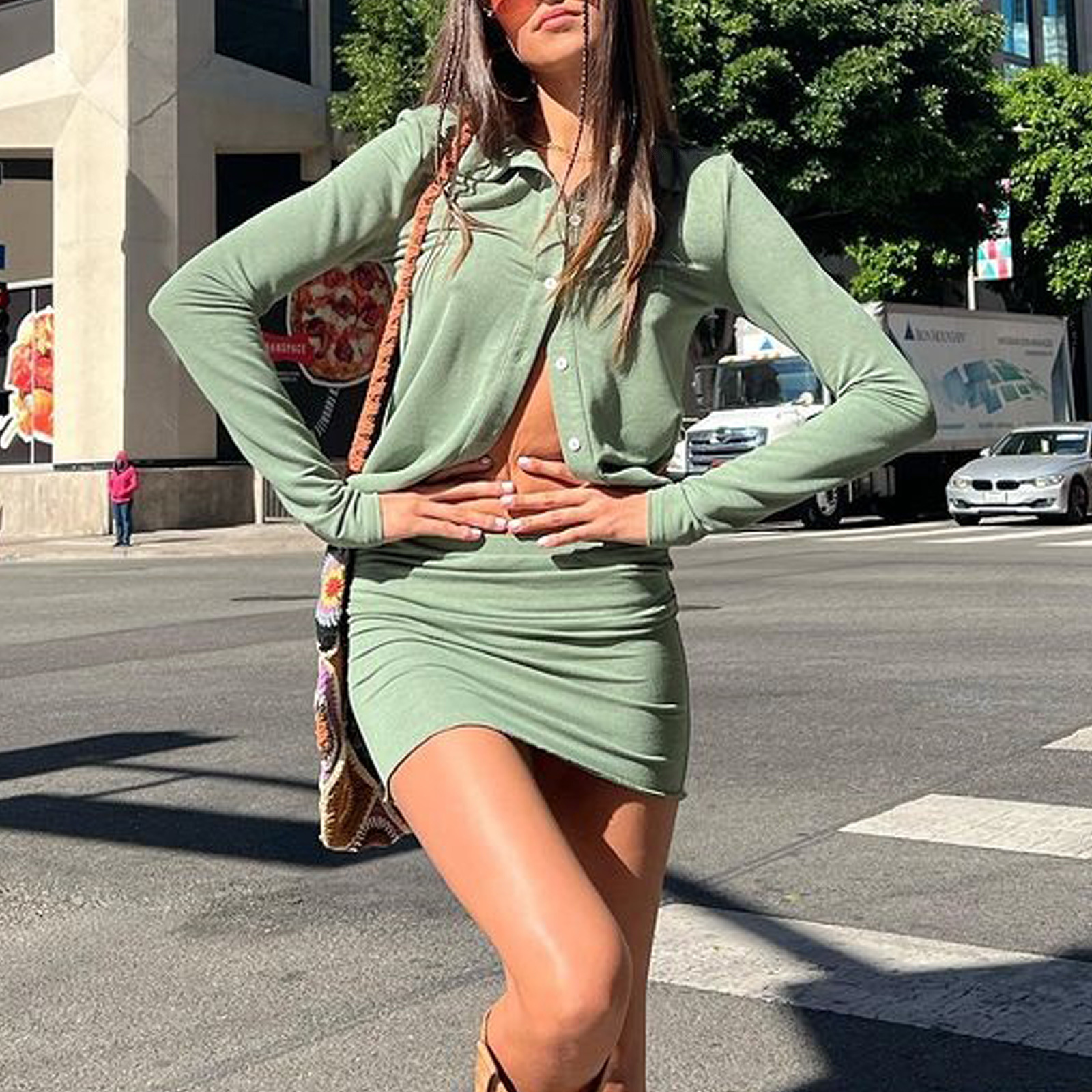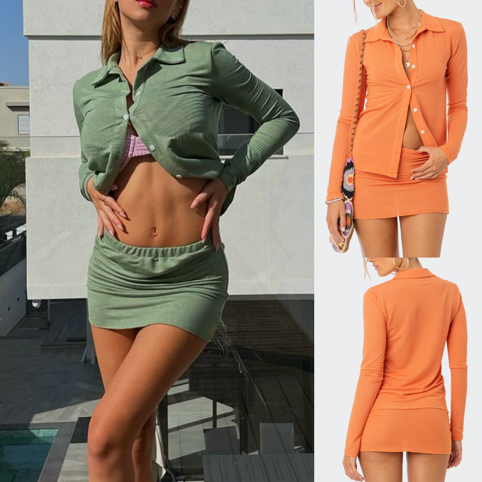Freizeitanzug, einfarbig, langärmeliges Oberteil mit Polokragen, einreihiger Hüftrock mit Kragen