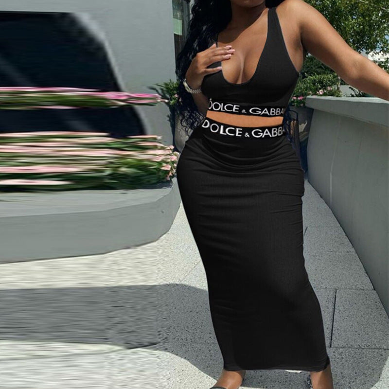 Lässiges Weste Etuikleid mit hoher Taille und Buchstabengrafikband, lässiges zweiteiliges Set