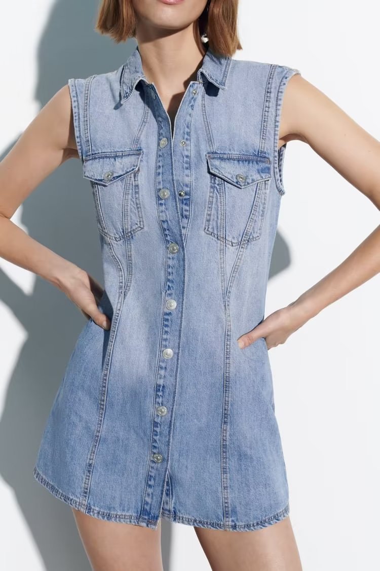 Ärmelloses Westenkleid mit Kragen, gerades, schmales, einreihiges Jeanskleid