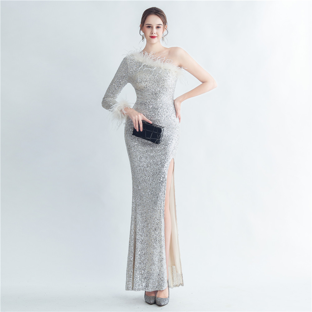 Craft Straußenfeder Dekorative Diagonale Schulter Römischer Kragen Seitenschlitz High End Abendkleid