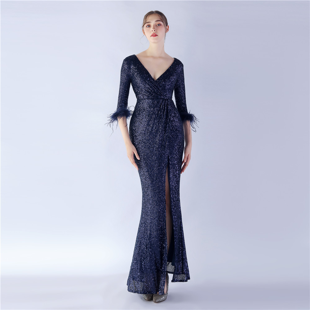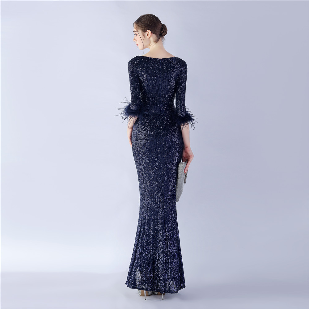 Craft – Langärmliges Abendkleid mit Pailletten und Straußenfedern