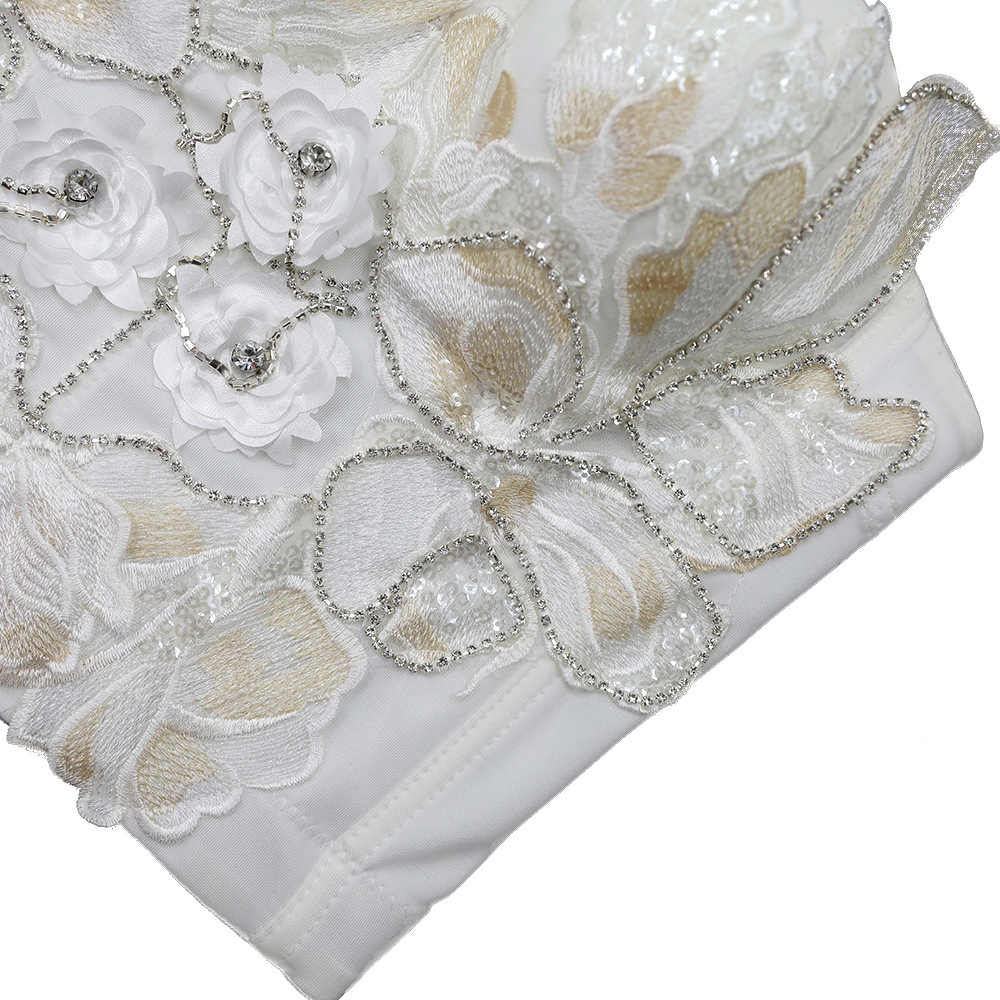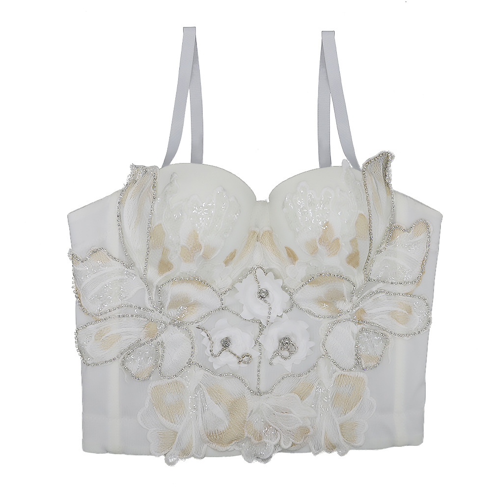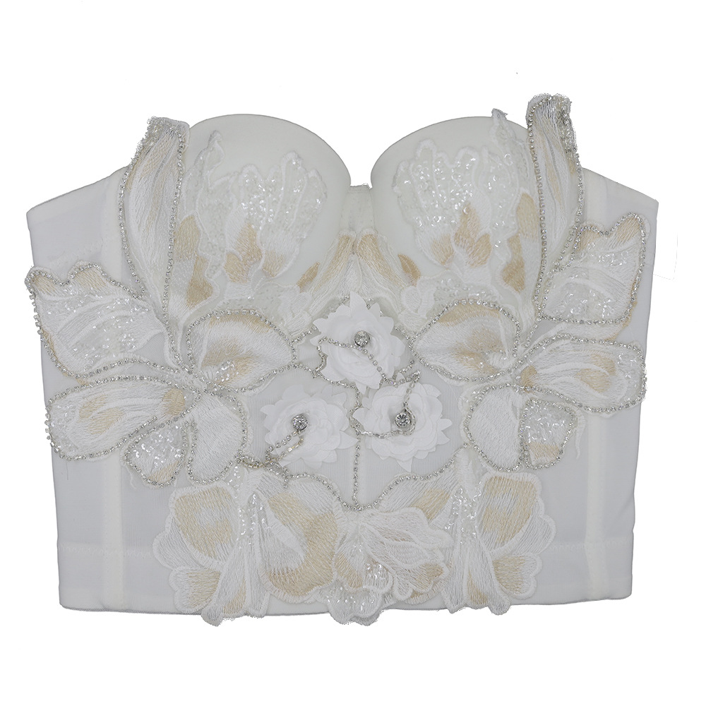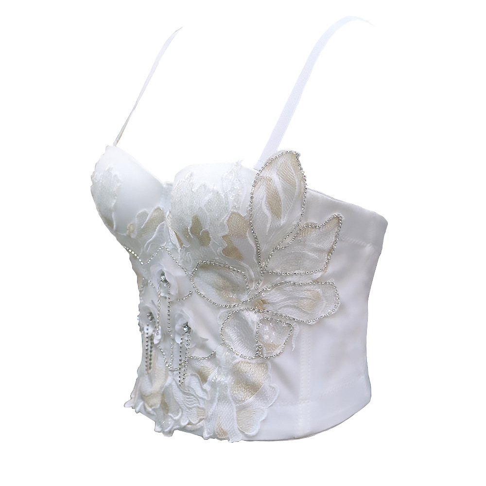 Französisches Korsett-Oberteil mit Bohrkette, umwickelte Brust, schlankmachendes, enges Korsett mit Perlen, dreidimensionales Blumenmuster, weiße Träger, Tube-Top-Weste