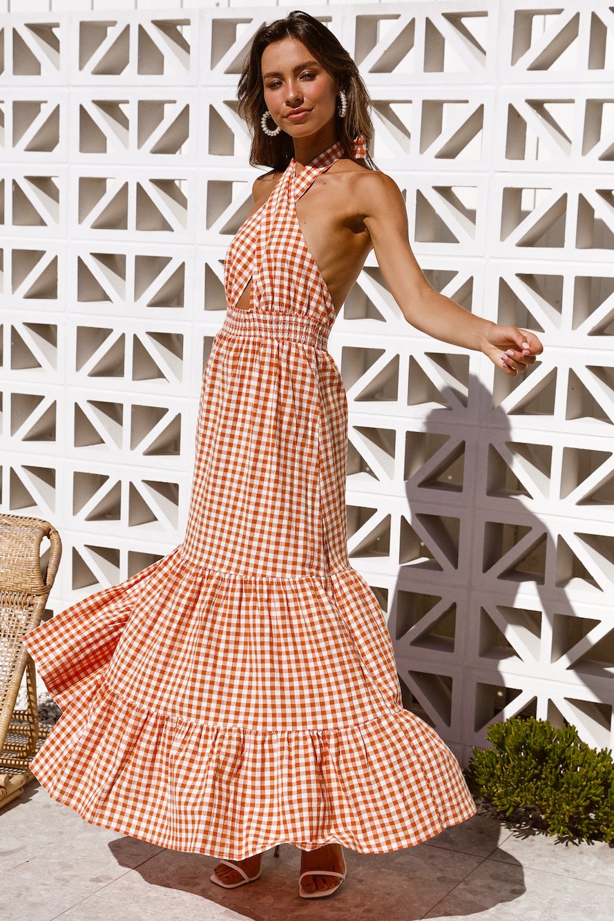 Elegantes, kariertes, rückenfreies, ärmelloses Maxikleid in A-Linie mit überkreuzten Bändern