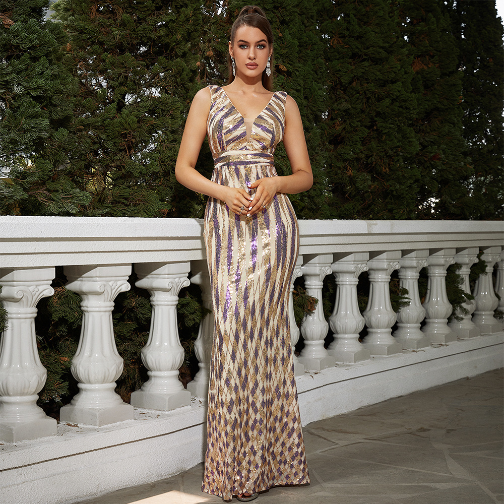 Elegantes langes Pailletten V-Ausschnitt rückenfreies Cocktail-Abendkleid Brautjungfernkleid