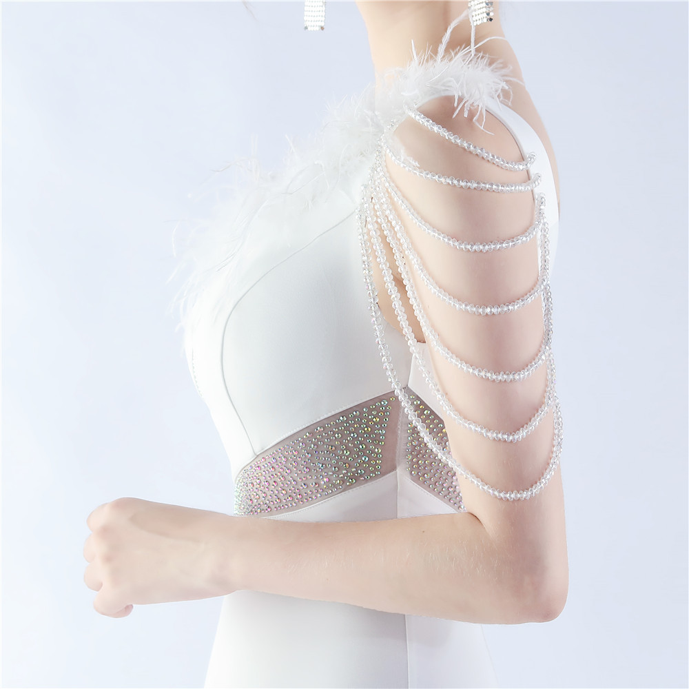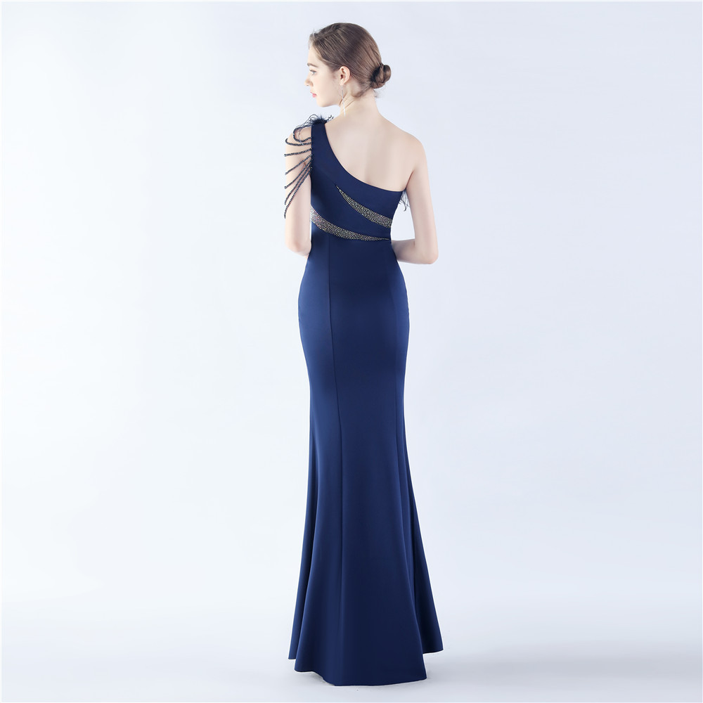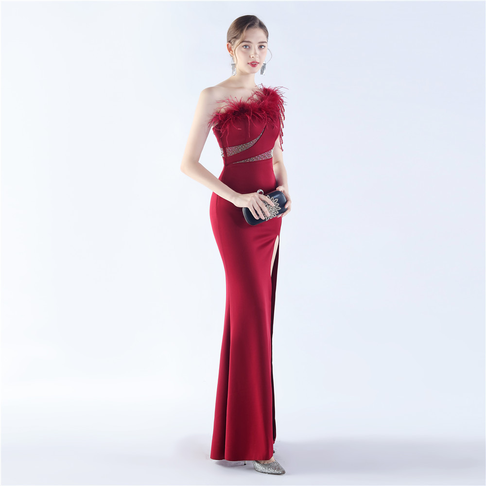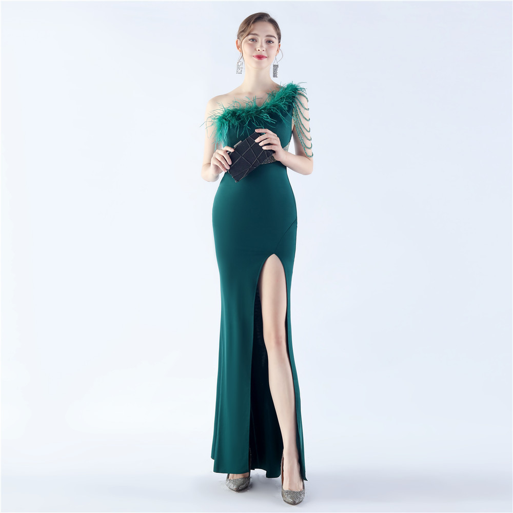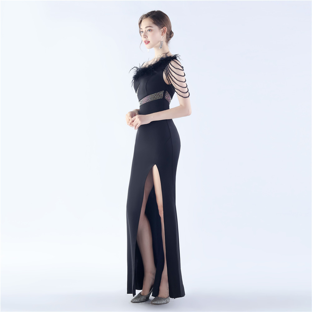 Abendkleid Craft Strass handgefertigt Perlen Straußenfeder diagonal Kragen One-Shoulder-Kleid