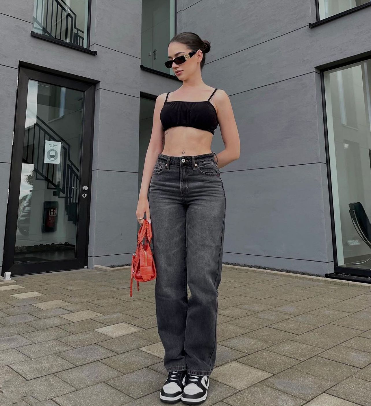 Hohe Taille Gerade Jeans Reines Schwarz Casual Lose Hängenden Straße