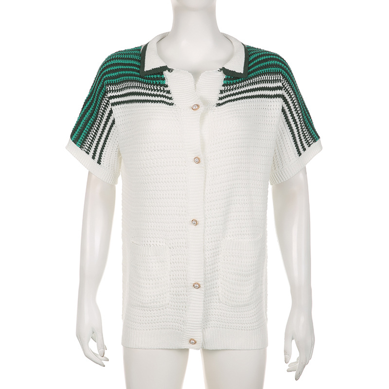 Gestricktes, lockeres T-Shirt mit Kragen und Bruststreifen, kontrastfarbene, kurzärmlige Bluse mit großen Plättchen