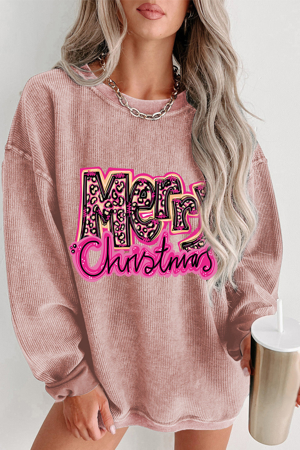 • Lassen Sie sich von der Weihnachtsstimmung mit diesem rosafarbenen Kordel-Sweatshirt mit dem Buchstaben „Merry Christmas“ verzaubern. Verleihen Sie Ihrem Outfit eine festliche Note.