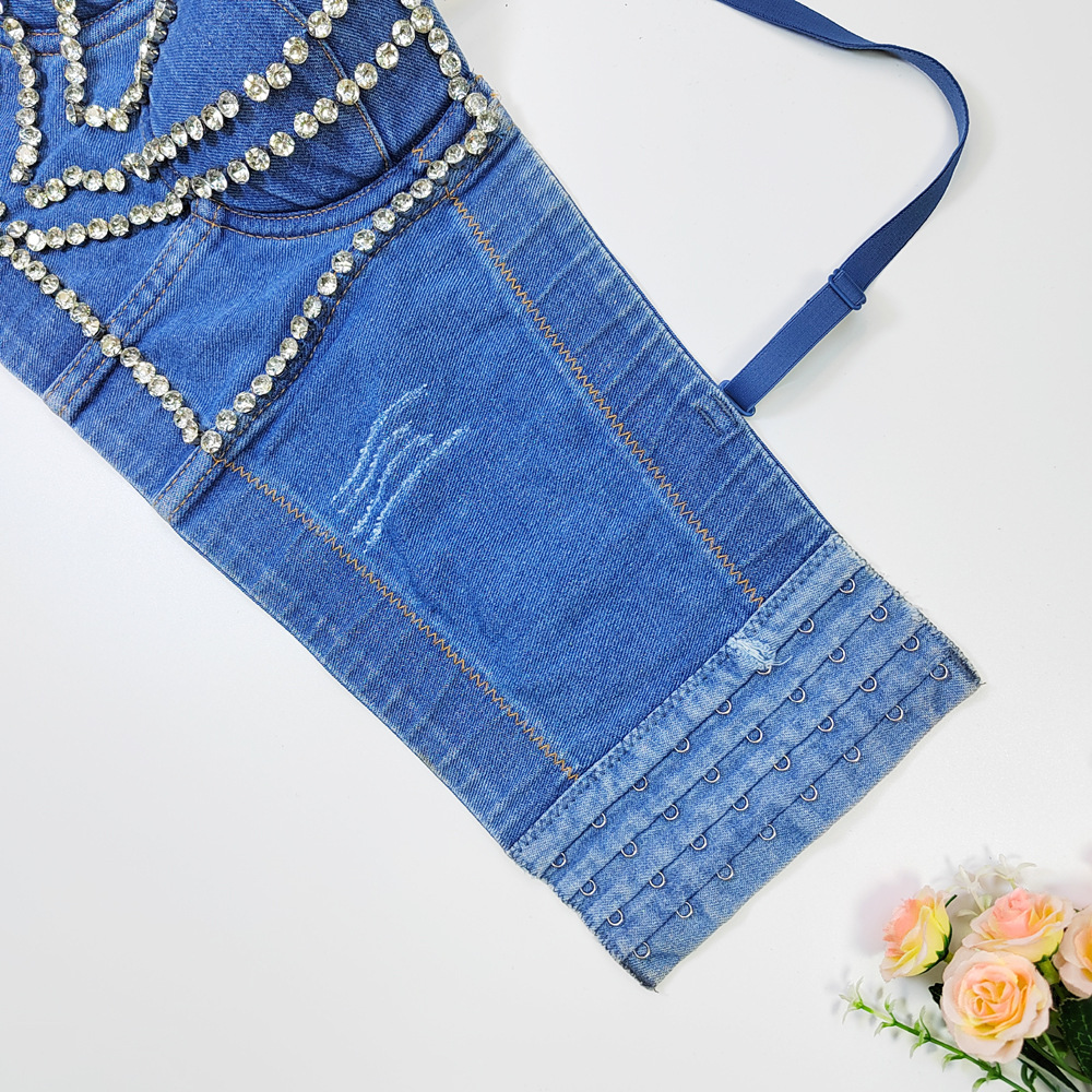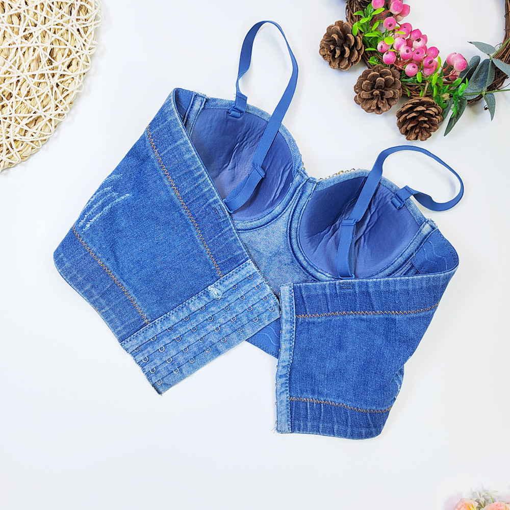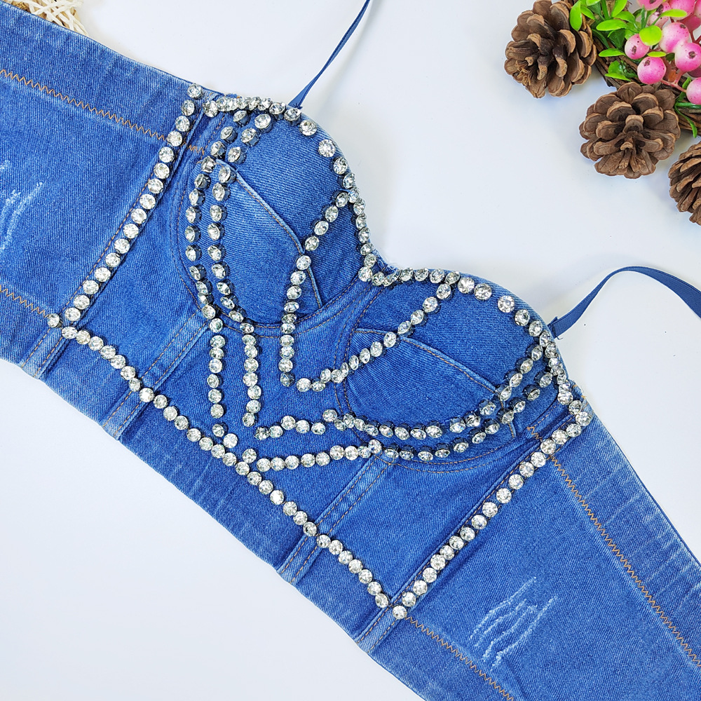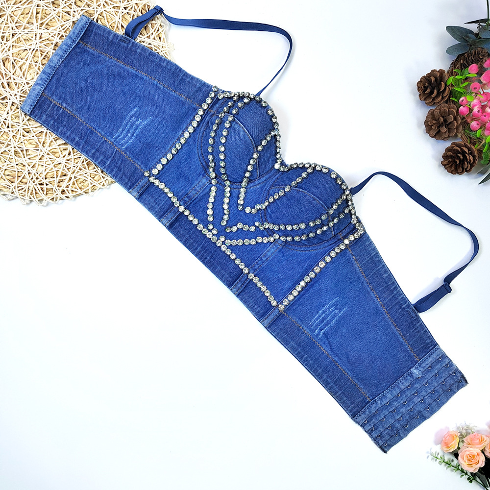 Punk-Perlen-Denim-Sling-Innenseite, schmales Korsett mit Knochen, umwickelte Brust, kurze Street-Hipster-Taille, Korsettweste mit Brustpolster