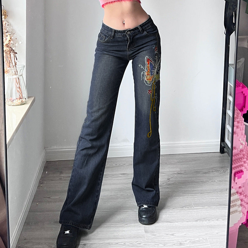Jeans im Retro-Stil mit Schmetterlingsstickerei, niedriger Bund, gerades Bein