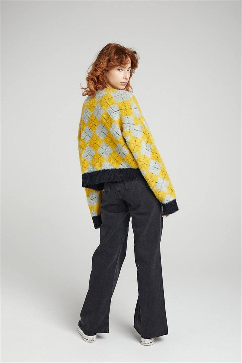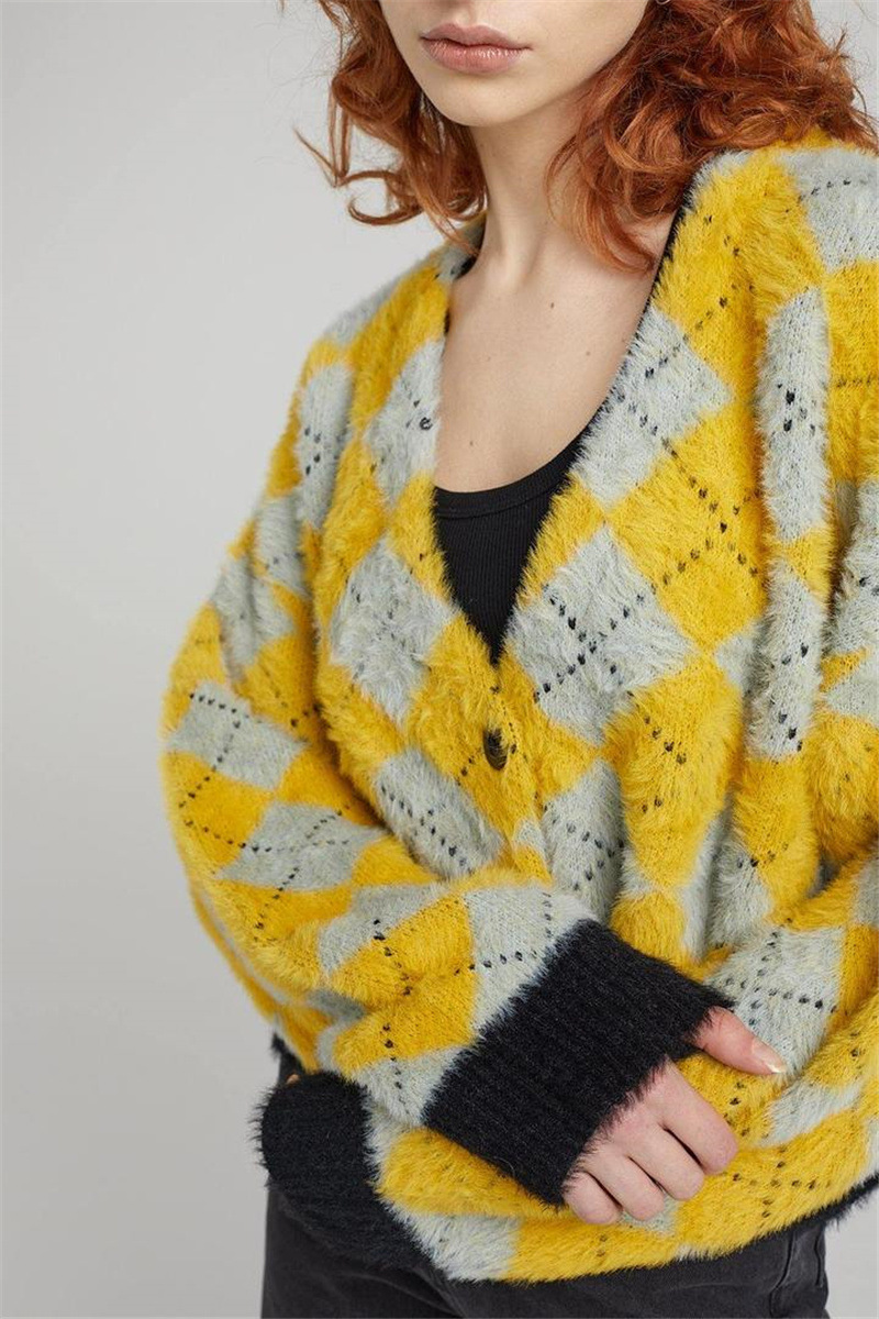 Retro Hit Farbe Diamant Gitter Plüsch Französisch Kurze Hochwertige Oberbekleidung Pullover Strickjacke