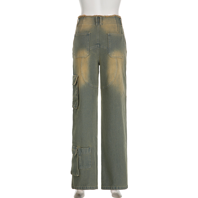 Jeans im Retro-Look mit verwaschener niedriger Taille und lockeren Taschen mit Nähten und Kanten, gerade geschnittene Street-Snap-Freizeithose