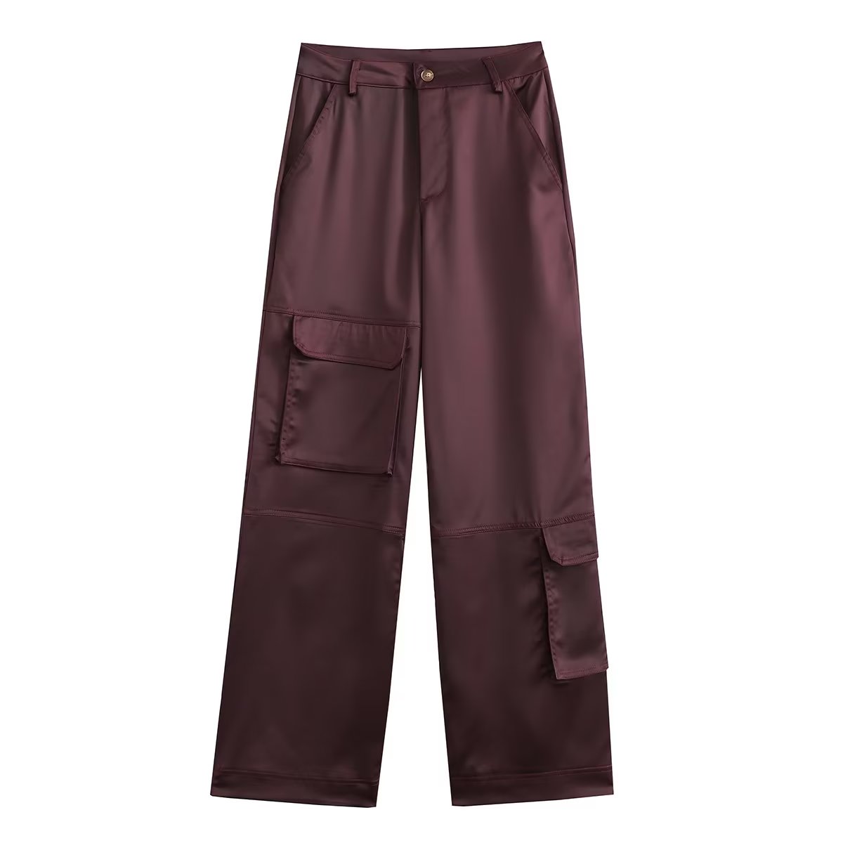 Strukturierte Latzhose aus Seidensatin mit Tasche und hoher Taille
