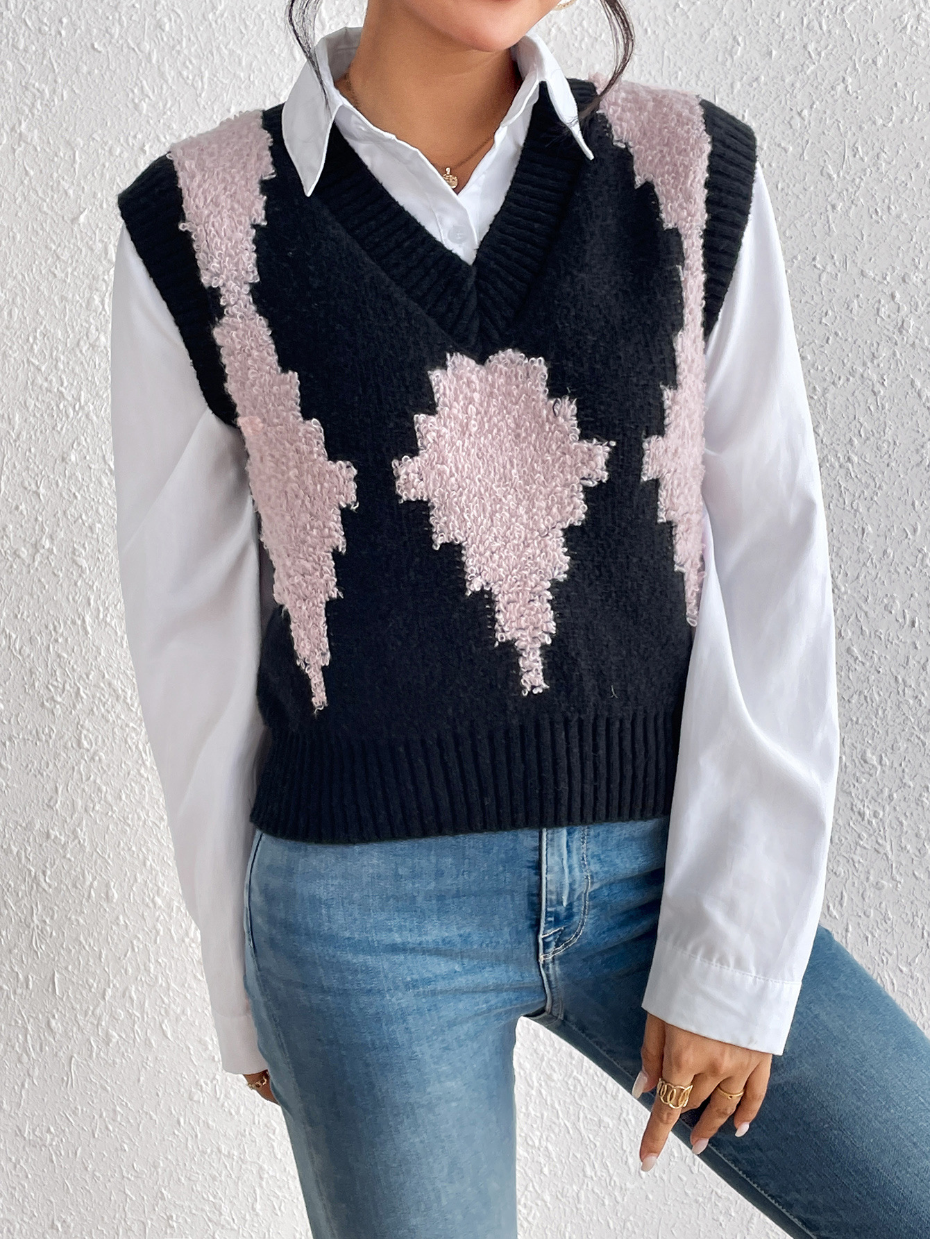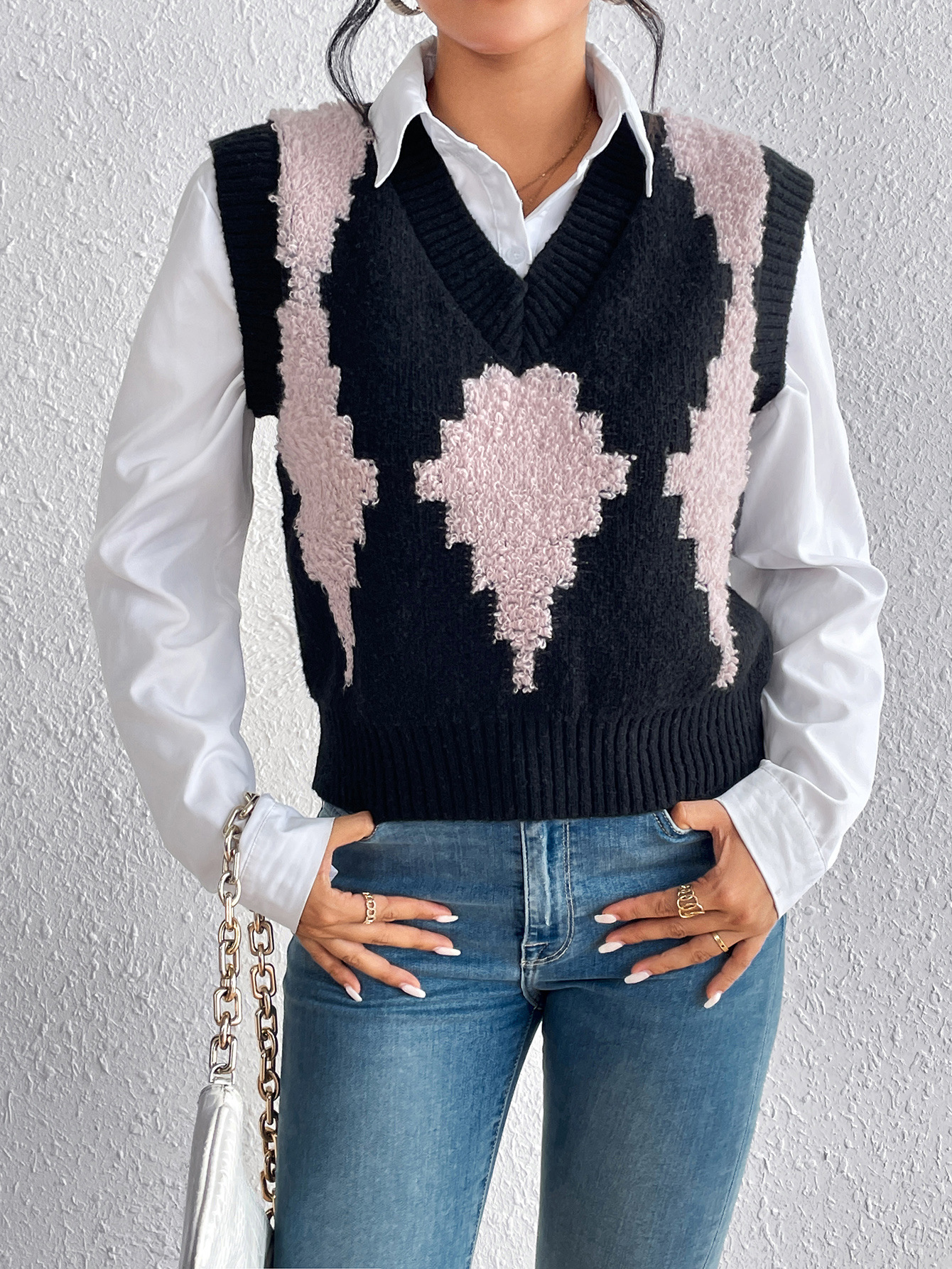 Einfache Farbkontrast Patchwork Diamantgitter Pullover Weste Gestrickt
