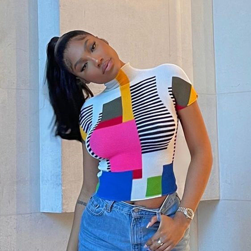 Street Hipster Halbrollkragen Kurzarm Geometrisch Abstrakt Bedrucktes Slim T-Shirt