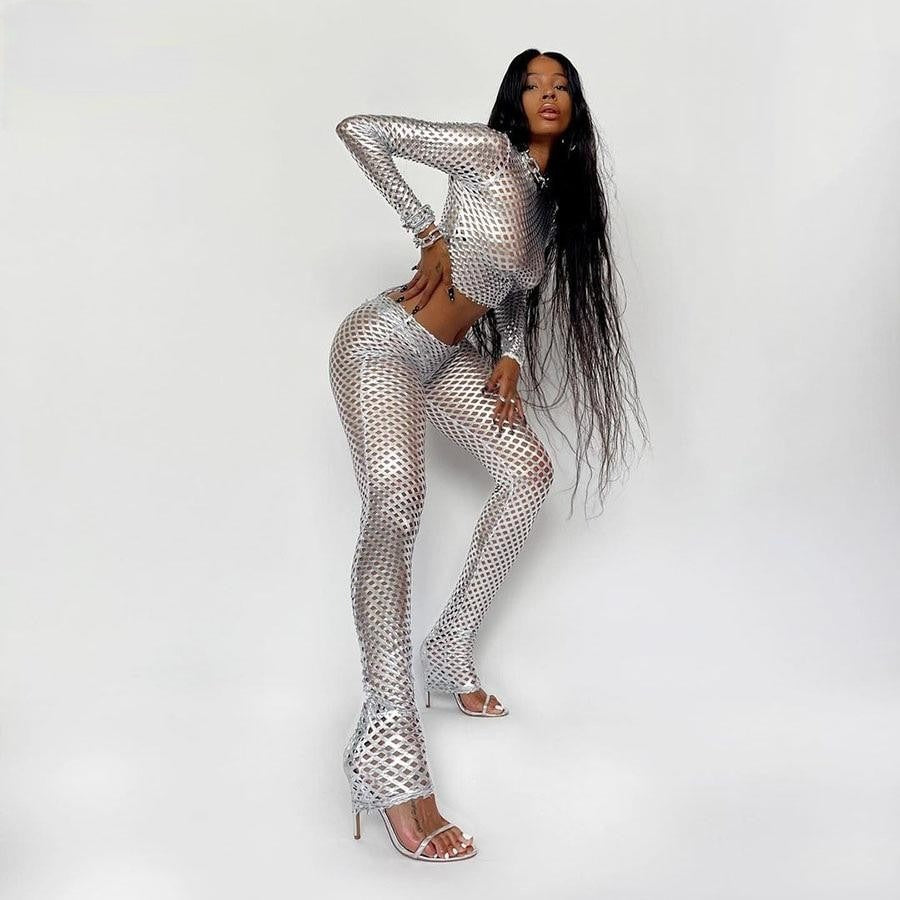 Verleihen Sie Ihrer Wochenendgarderobe mit dieser Hose einen Hauch von Charakter. Aus silbernem, ausgehöhltem Material mit geradem Beinschnitt. Wir sind begeistert. Tragen Sie dazu ein farblich passendes Crop-Top und Ihre High Heels für einen Look, der garantiert alle Blicke auf sich zieht.