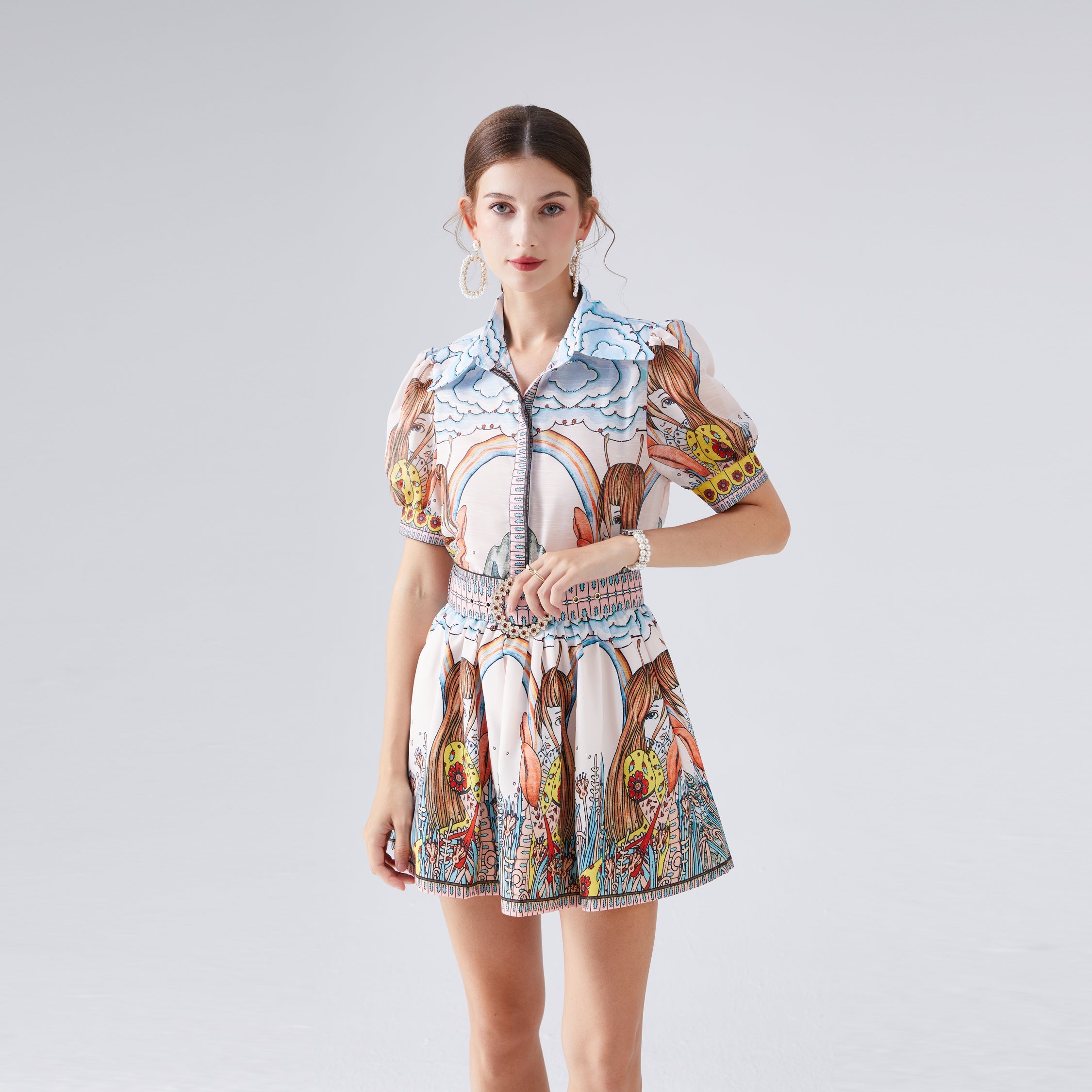 Zweiteiliges Set mit kurzärmligem, positioniertem, bedrucktem Seidenleinenhemd und kurzem Rock