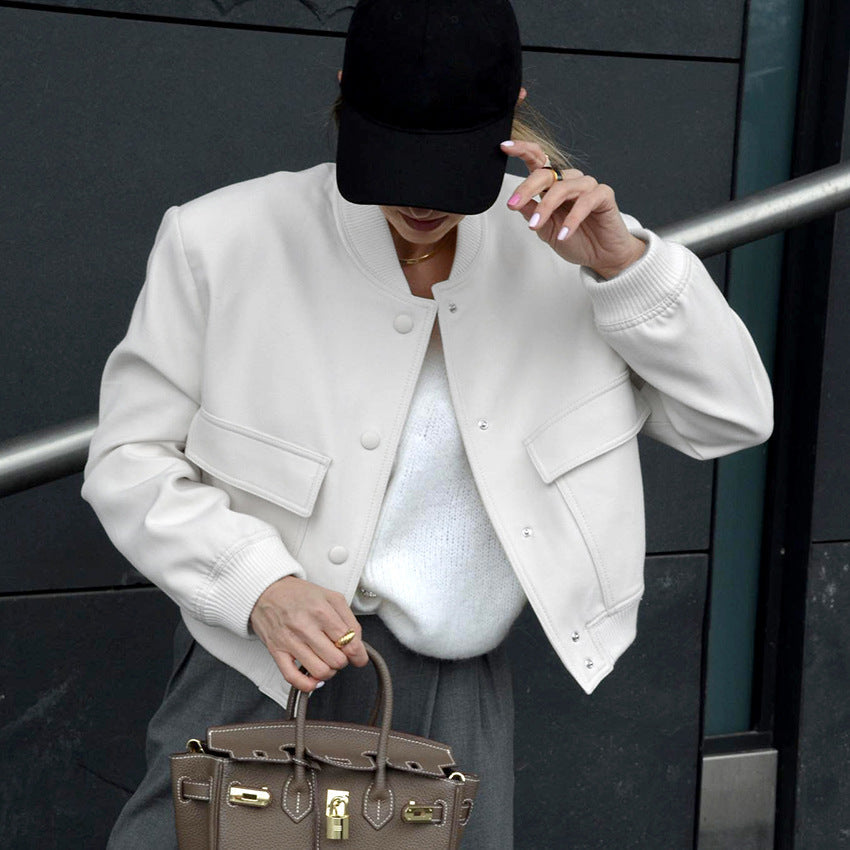 Weiße, schmal geschnittene, langärmlige Collegejacke, passende Oberteile, Jacken und Mäntel