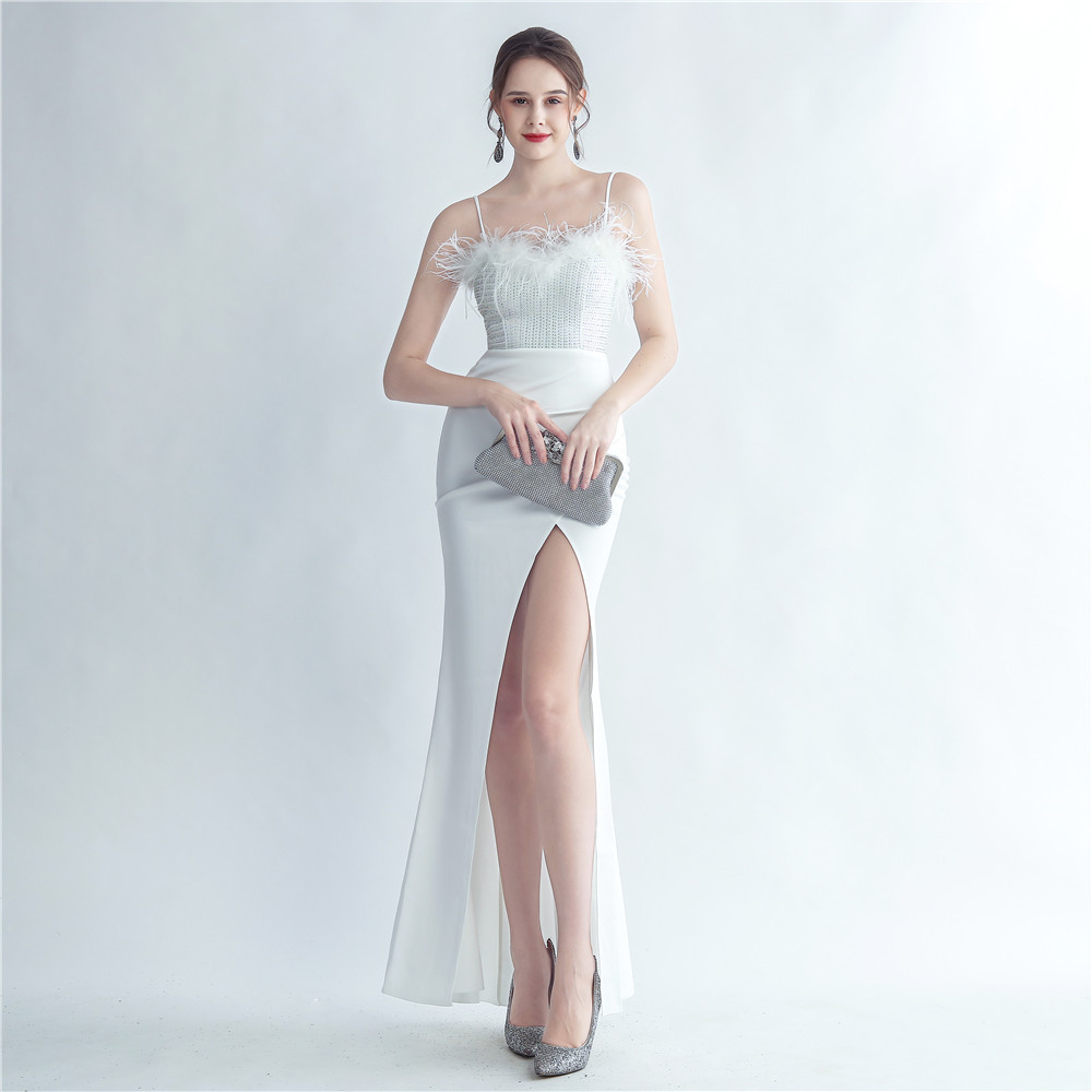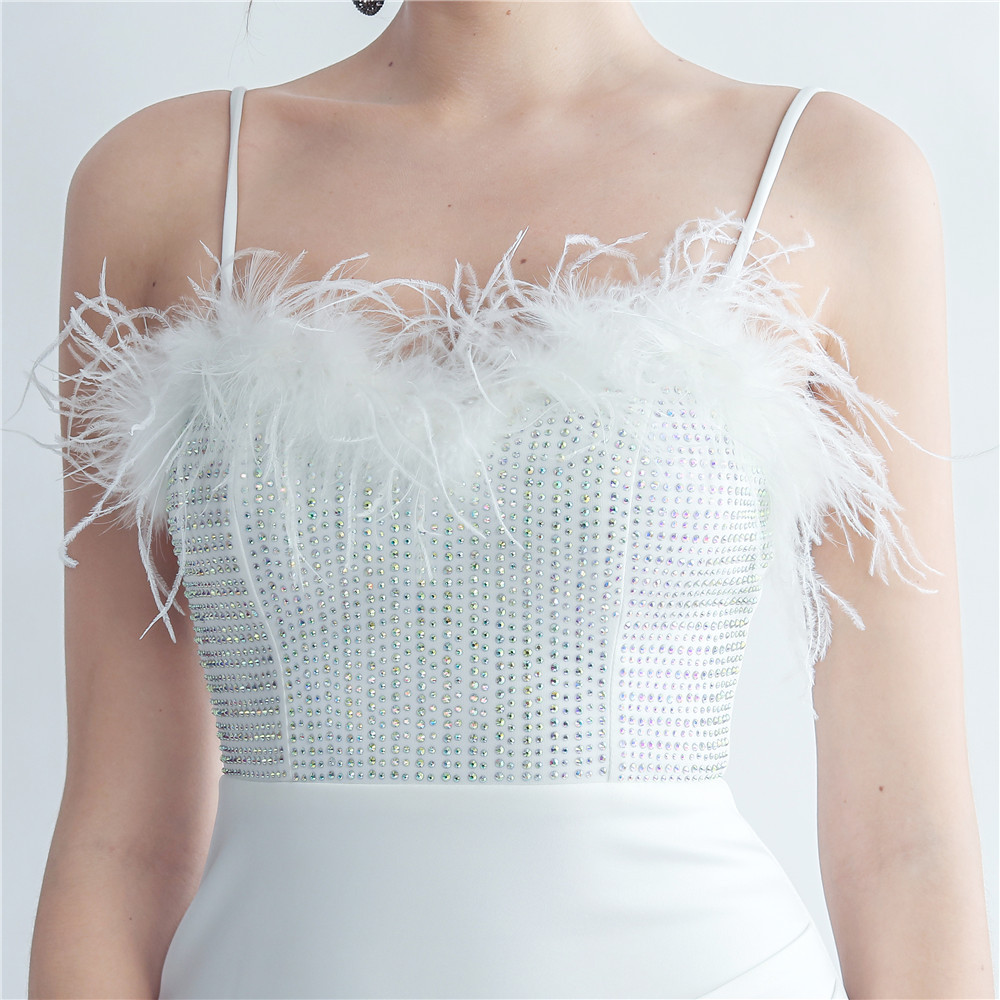 Robe de soirée haut de gamme en plumes d'autruche avec fente latérale et broderie artisanale