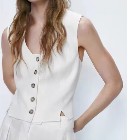 Cardigan boutonné sans manches à col en V et gilet court de couleur unie