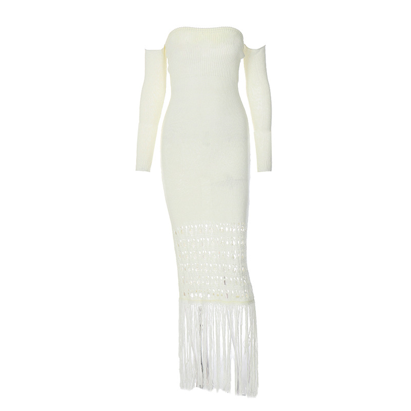 Robe élégante à franges et coupe ajustée, manches longues, épaules dénudées, haut tube
