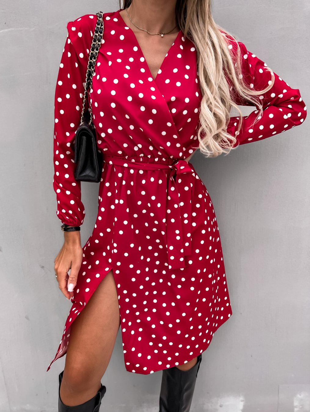 Robe trapèze fendue haute à manches longues et ceinture à pois pour l'automne