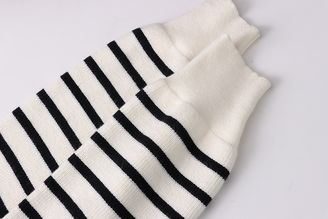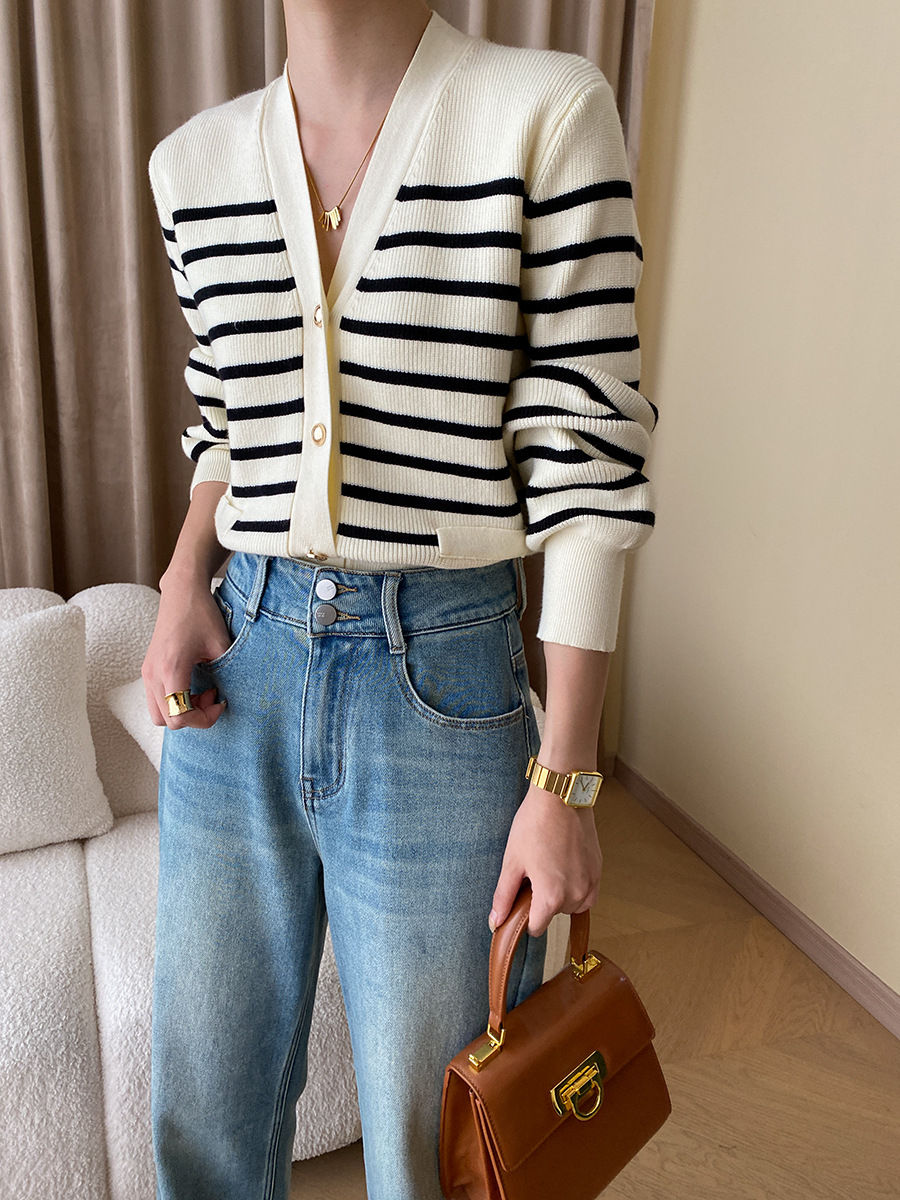 Cardigan tricoté à rayures contrastées à la mode française, col en V, pour le bureau, assorti à tout