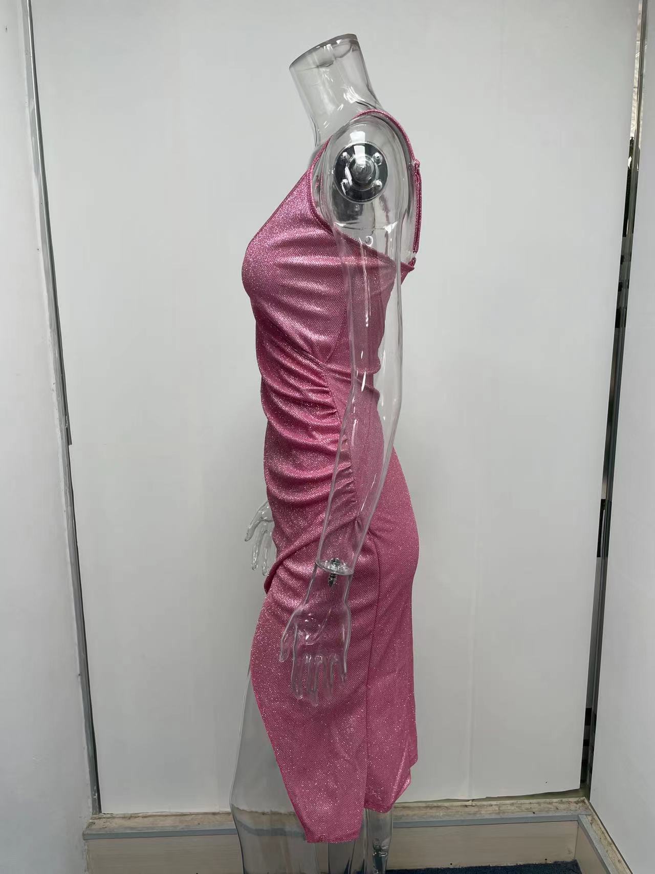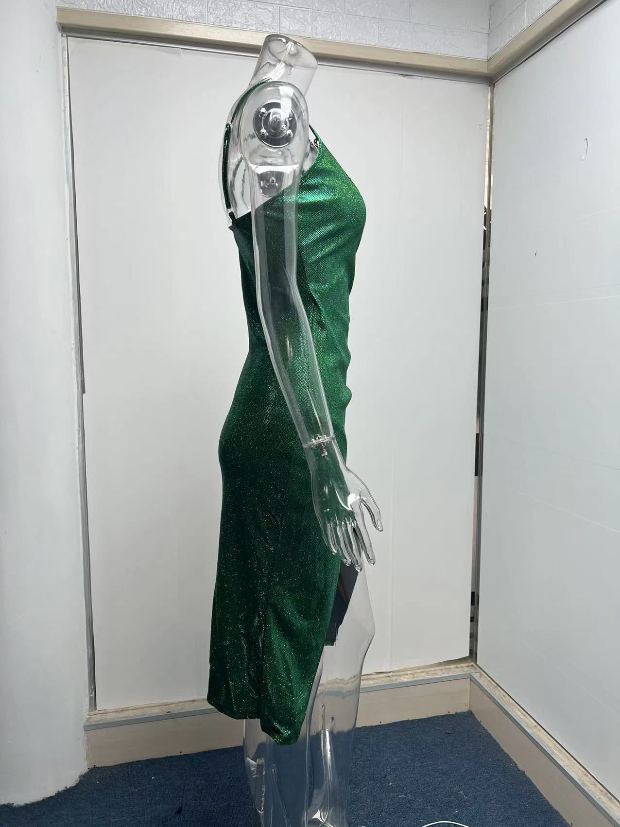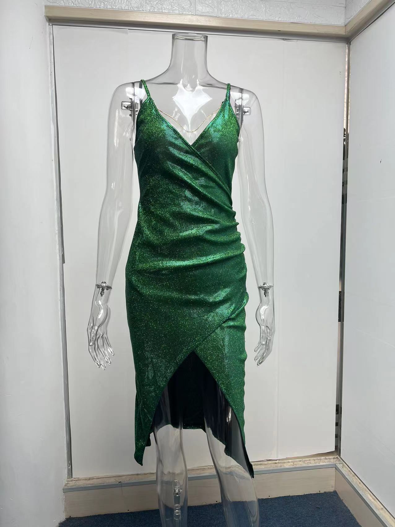 Robe à paillettes, fente haute, décolleté en V profond, bretelles plongeantes