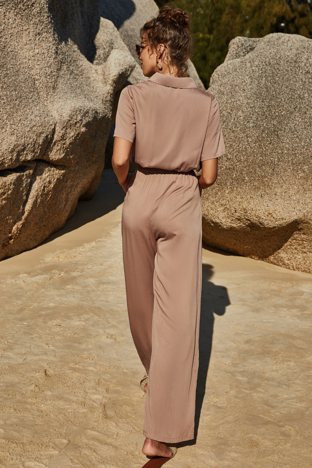 Combinaison une pièce à manches mi-longues, couleur unie, fermeture éclair, col, taille élastique, pantalon décontracté