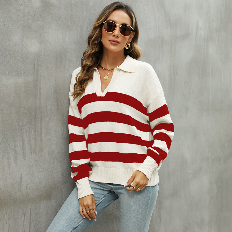 Pull à manches longues et col polo, pull ample à rayures et couleurs contrastées