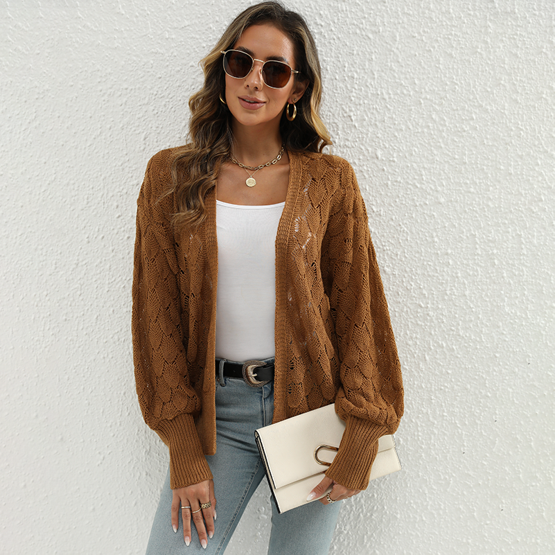 Cardigan tricoté mi-long, coupe ample et confortable, avec découpes et ajourées