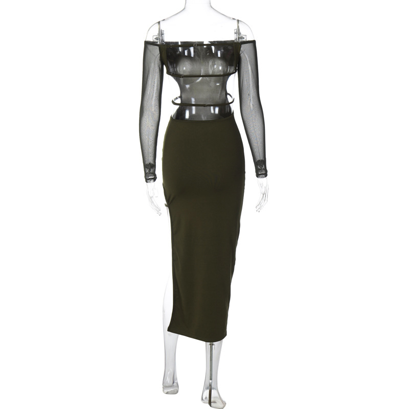 Robe mi-longue fendue à manches longues et épaules dénudées
