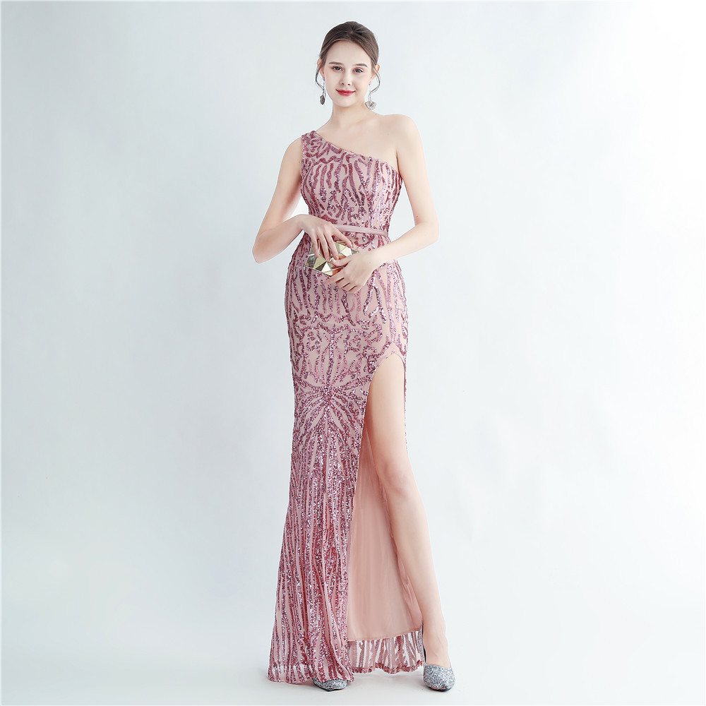 Robe de soirée longue à paillettes florales et à une épaule, col diagonal, fente latérale