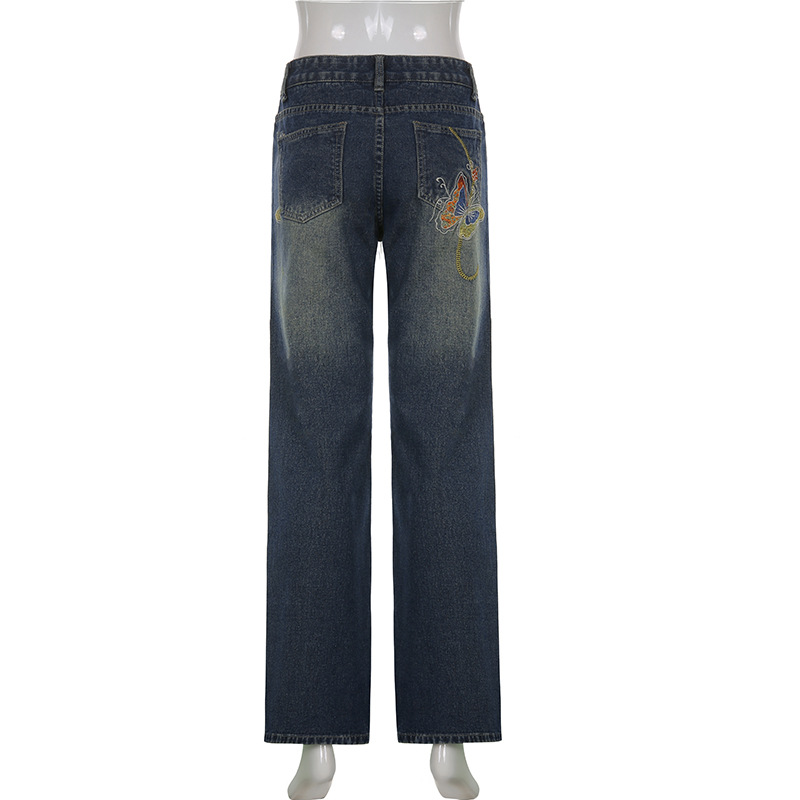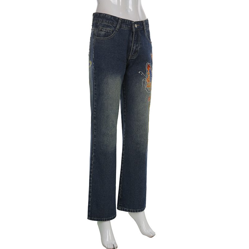 Jean rétro vieilli brodé de papillons, taille basse, pantalon droit pour le nettoyage du sol