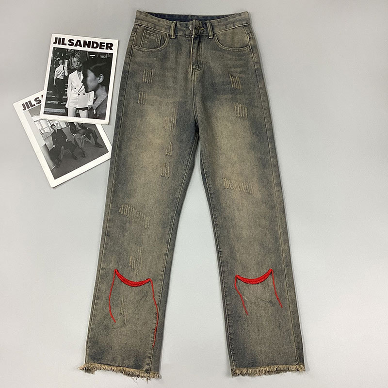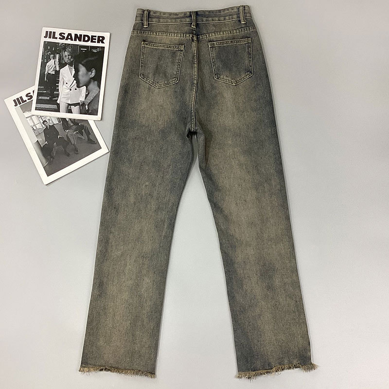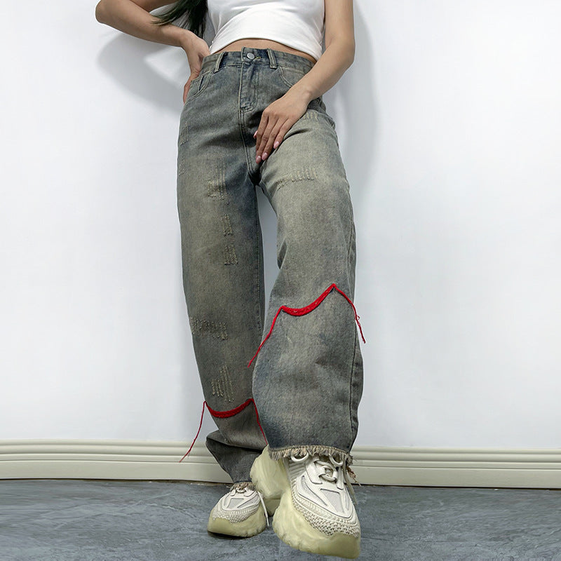Jean rétro coupe droite à ourlet effiloché, taille haute, pantalon ample amincissant