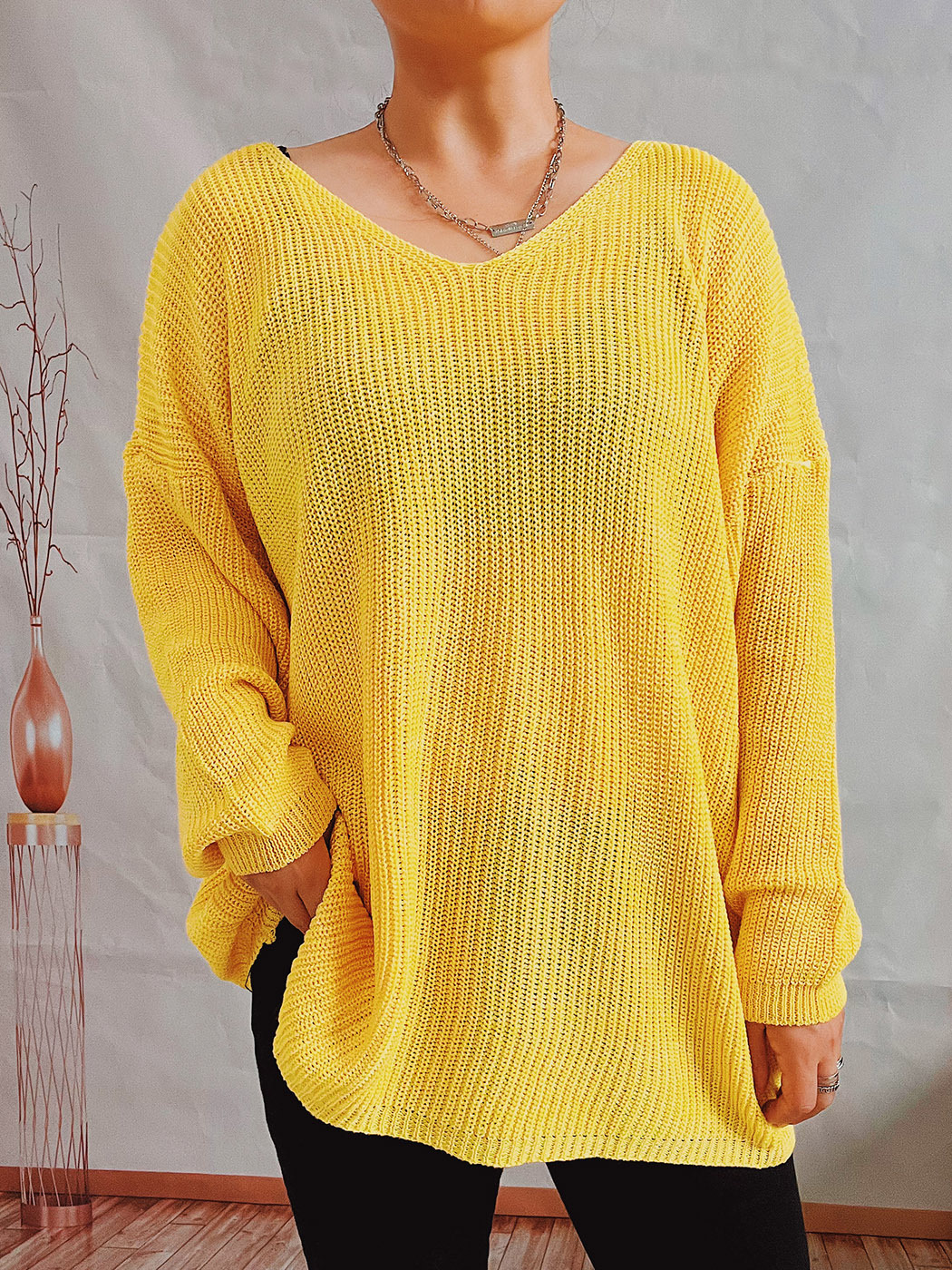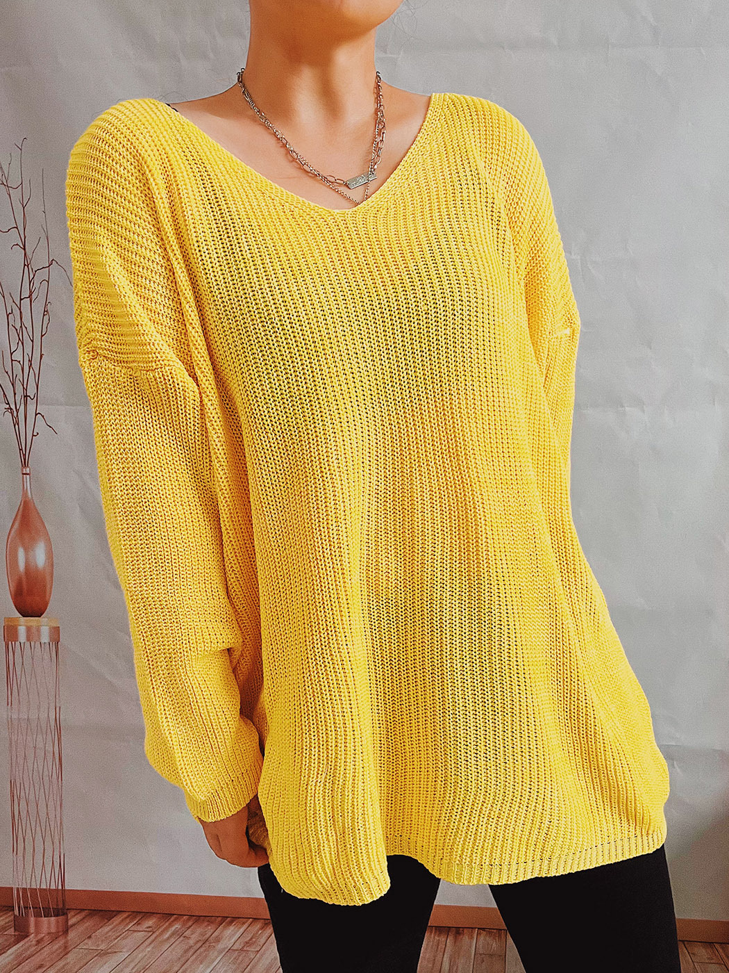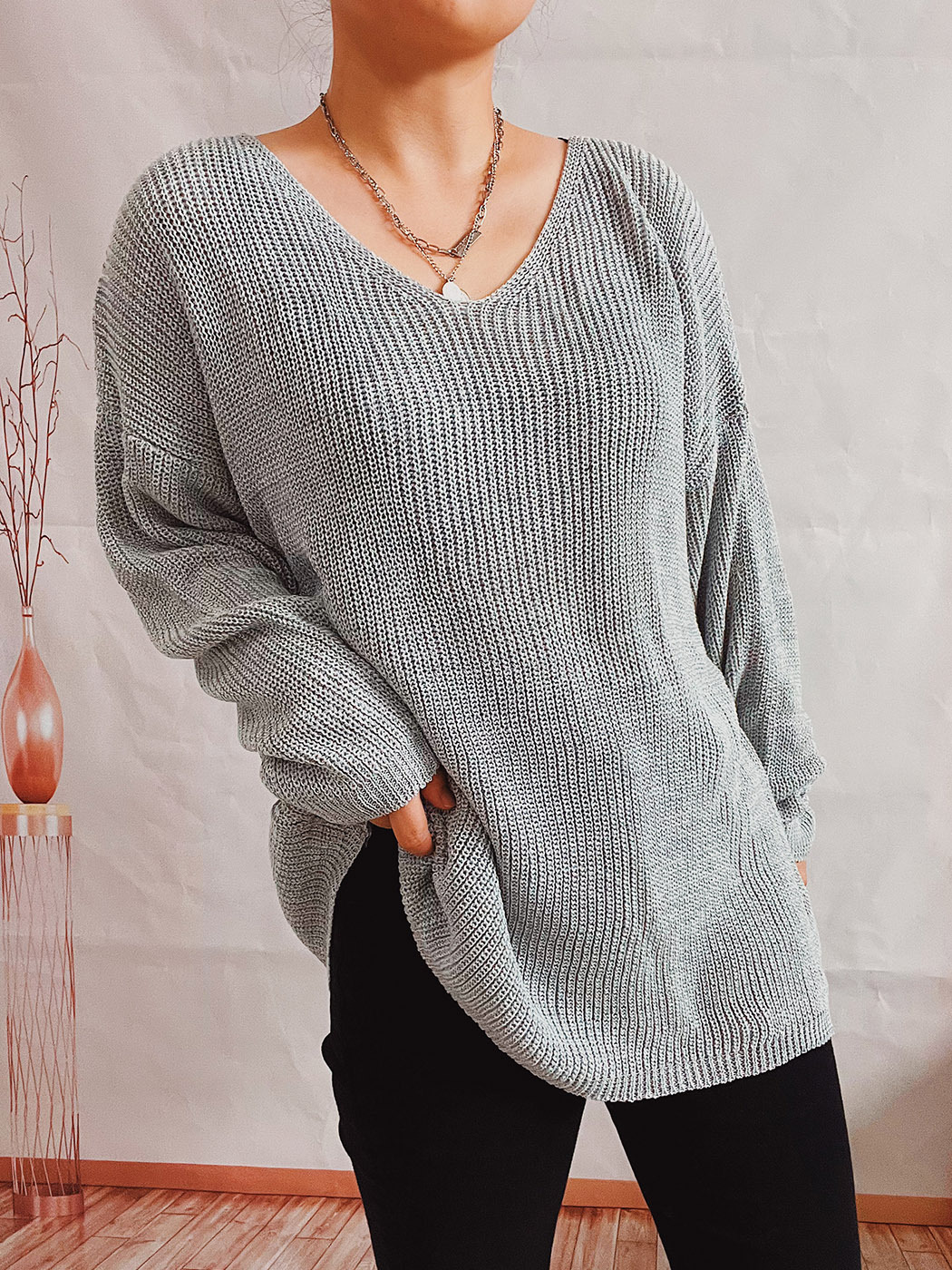 Pull simple, ample, couleur unie, col en V, manches longues, tricot fin