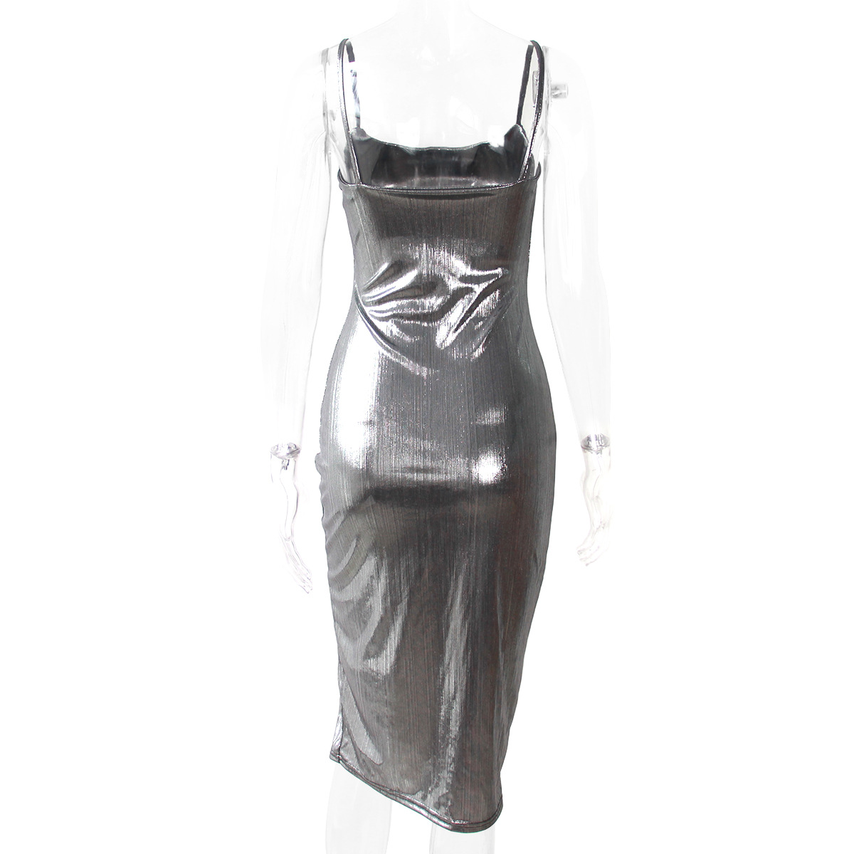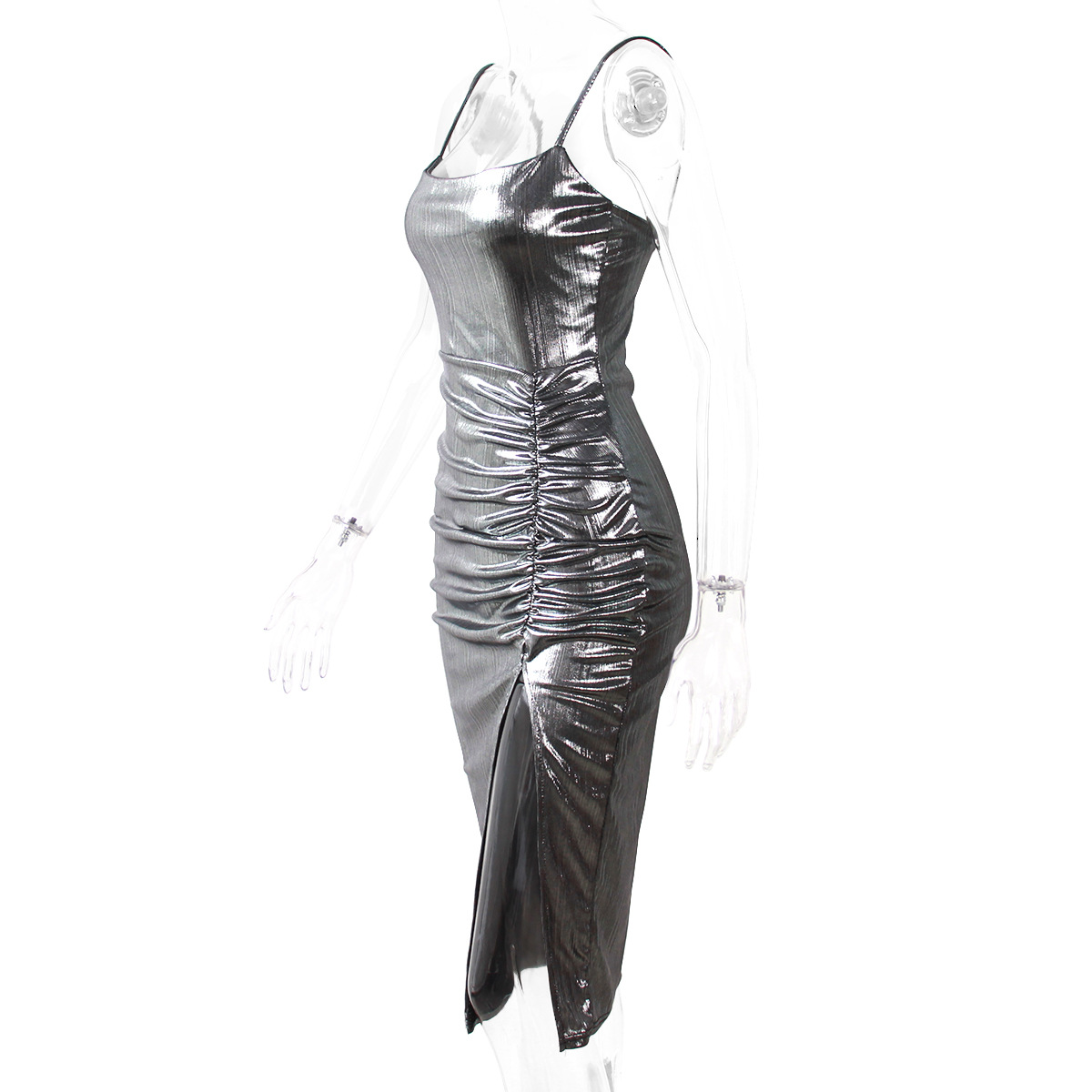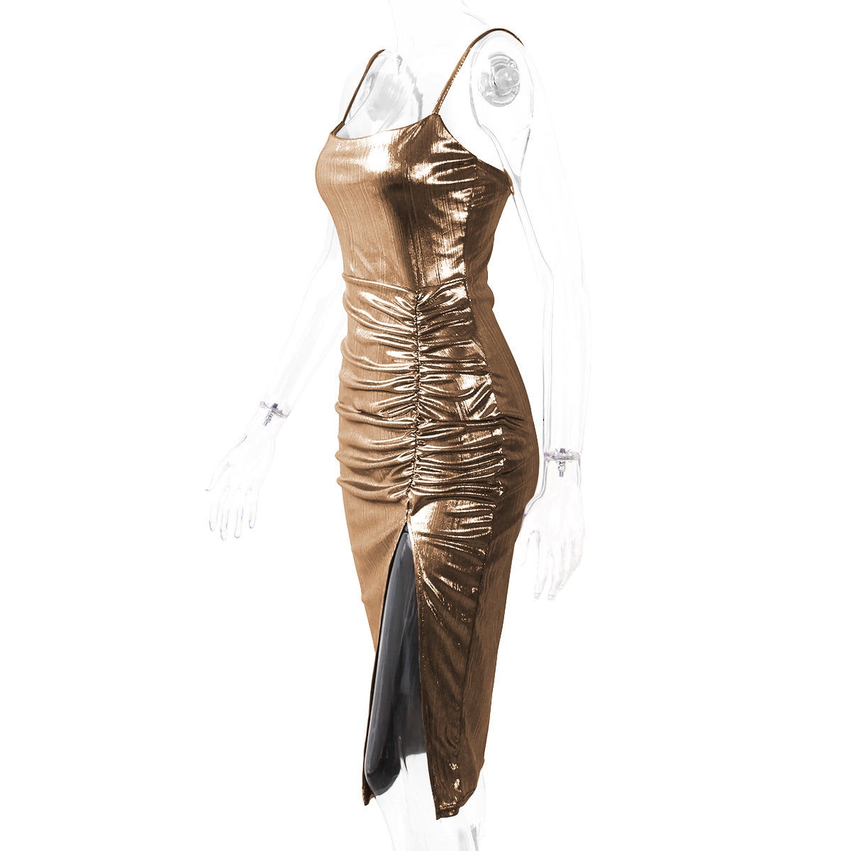 Robe de soirée moulante fendue avec bretelles dorées et argentées brillantes