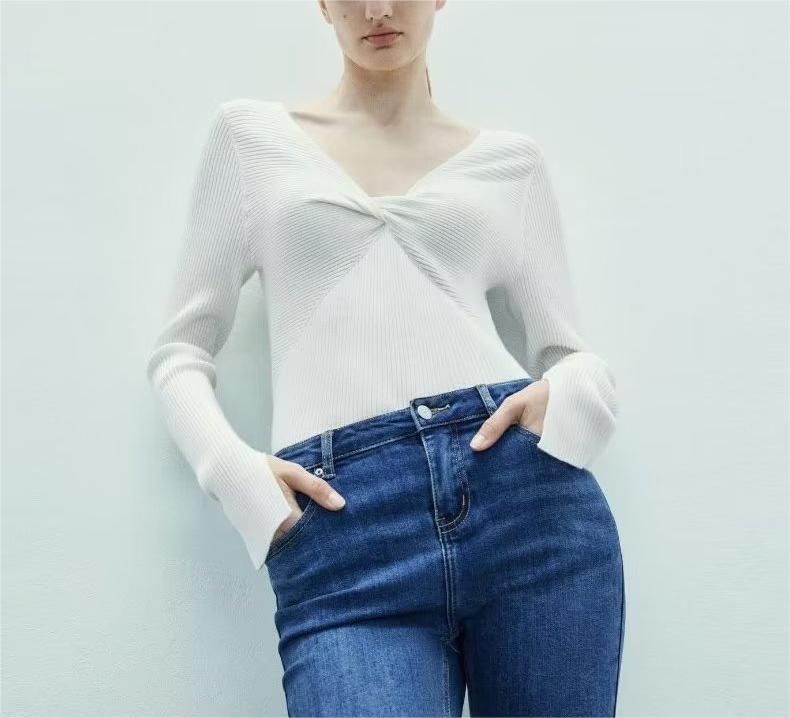 Pull en tricot à manches longues et col en V avec nœud torsadé de couleur unie