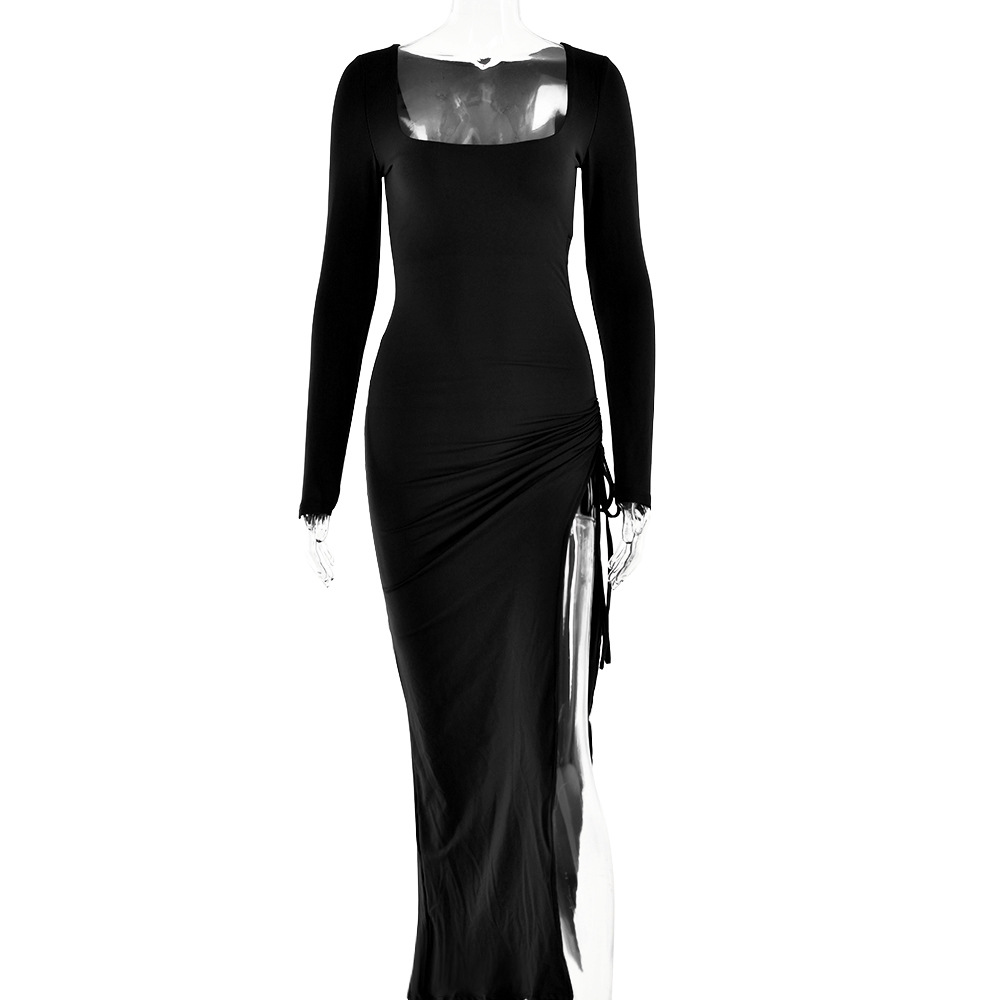Robe longue fendue à col carré et manches longues avec cordon de serrage