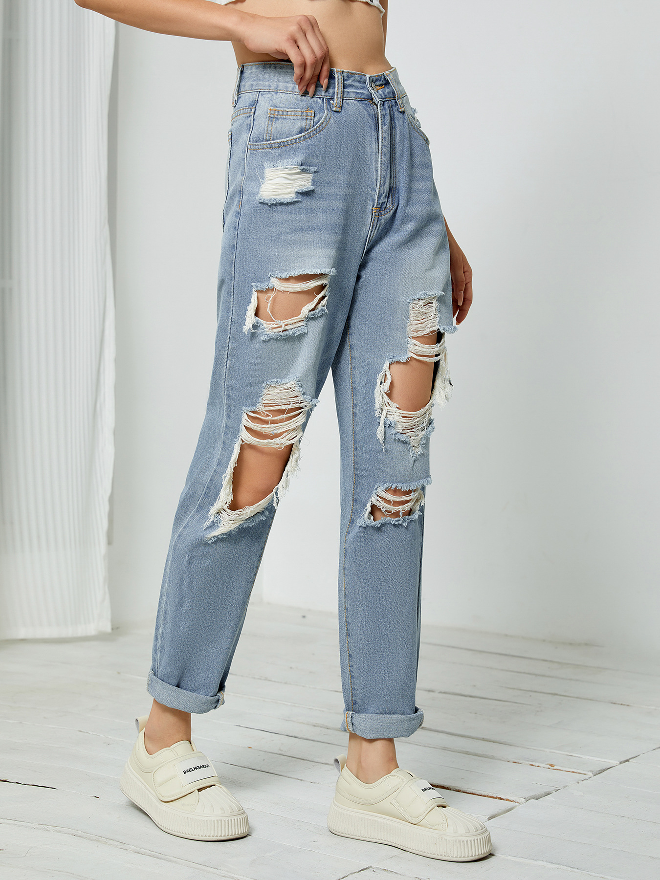 Pantalon droit délavé avec trous cassés, jean taille haute