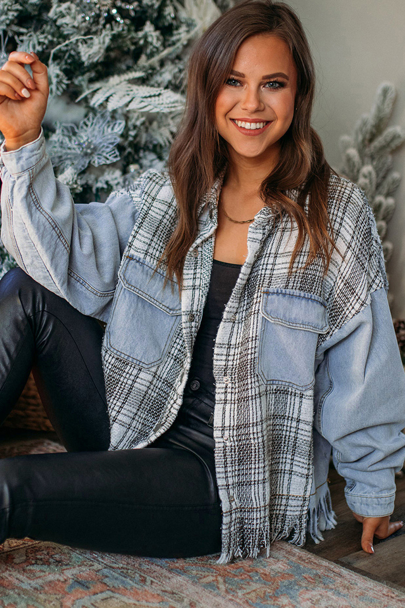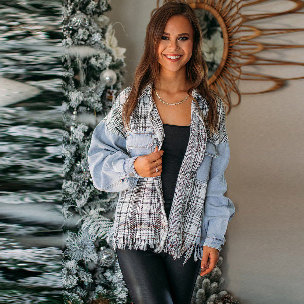 Veste en jean patchwork à carreaux de rue Veste à col et pompons