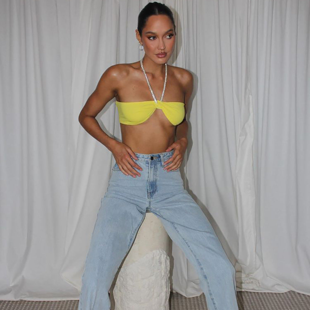 Haut fin jaune élégant à bretelles et col licou, haut tube taille haute, gilet court et slim
