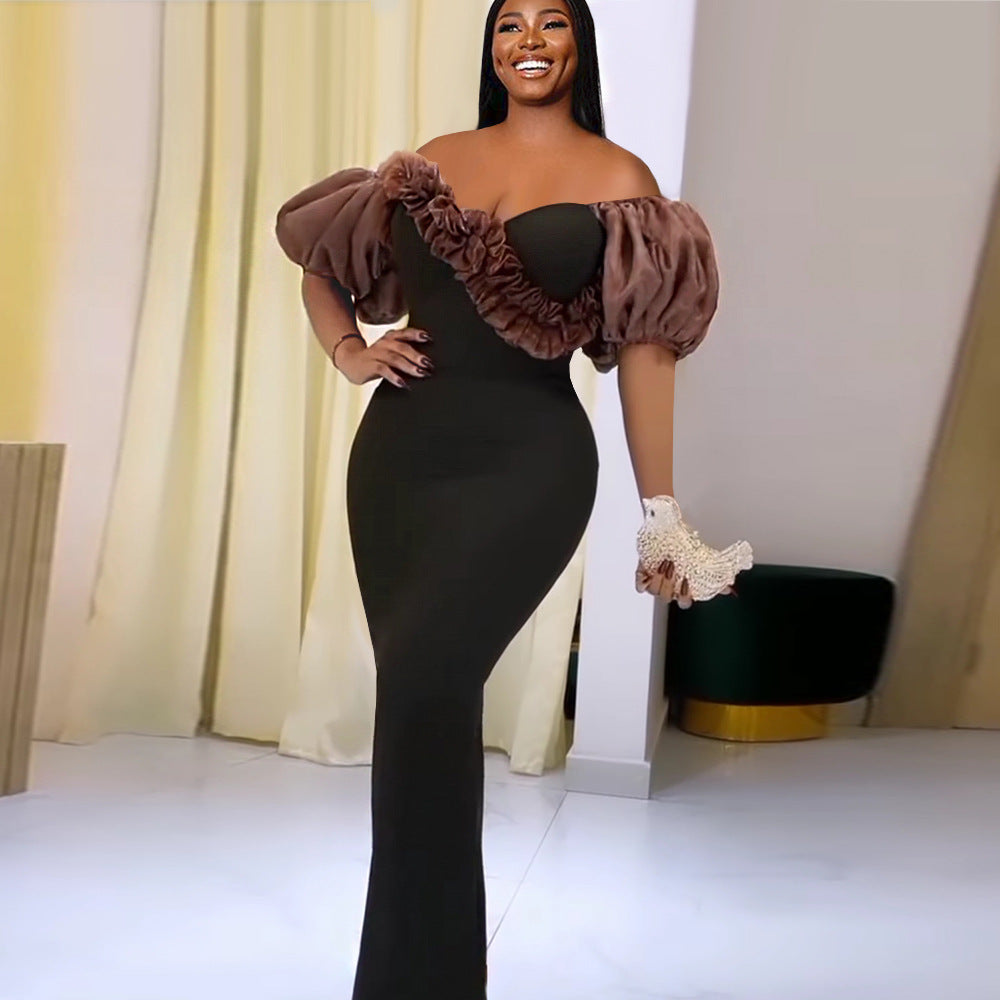 Robe de Noël élégante à manches lanternes et haut tube, robe de cocktail taille haute