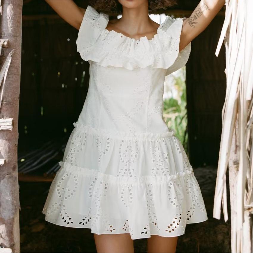Robe blanche à col français et épaules dénudées brodée