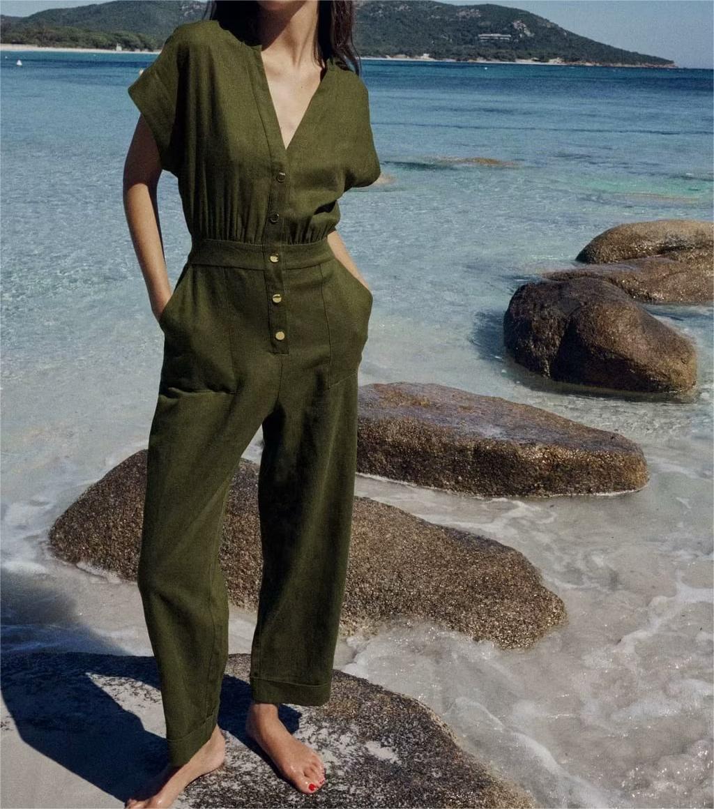 Army Green Long Jumpsuit V Neck Decorated Row Button Waist Trimming Short Sleeved Jumpsuit