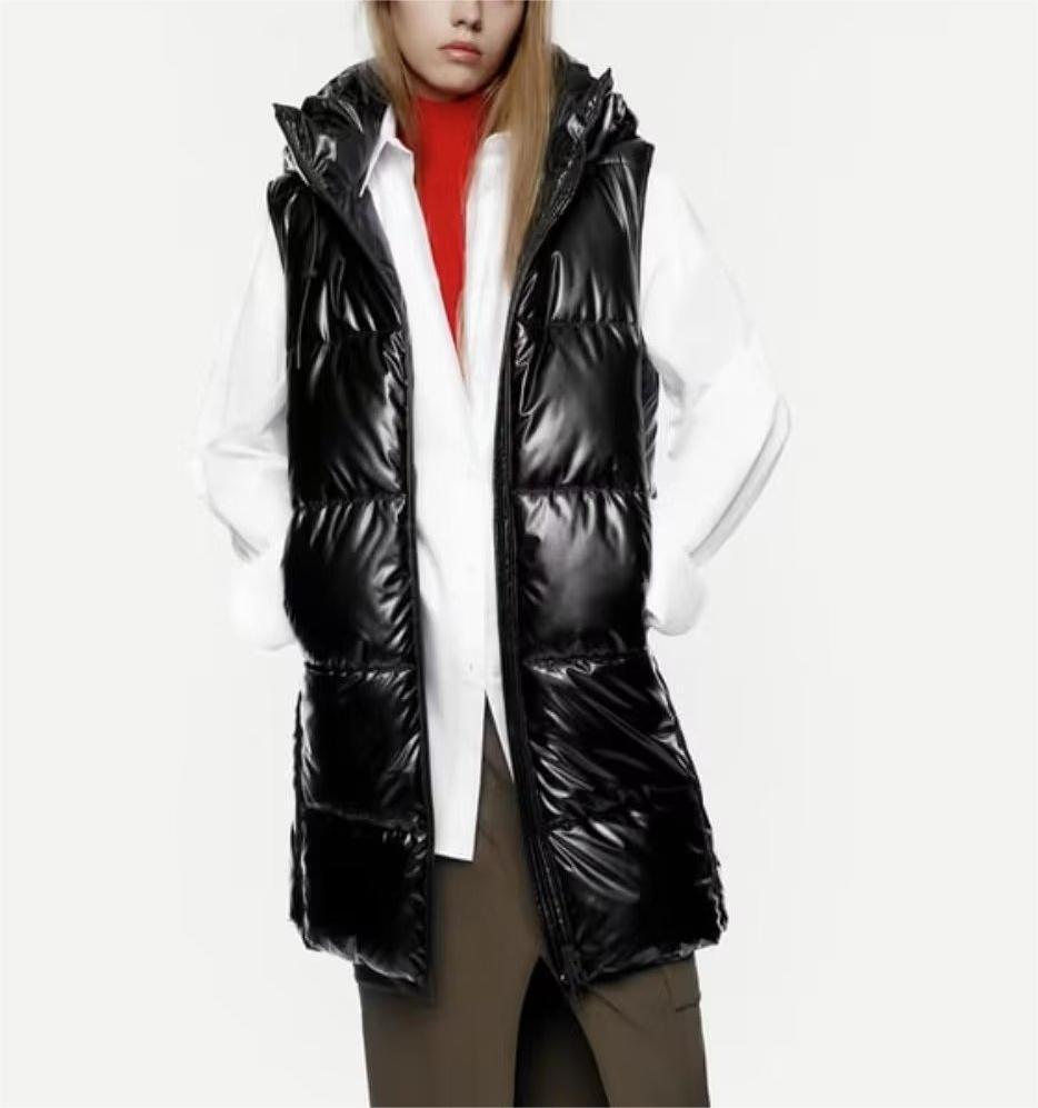 Black Faux Leather Cotton Padded Long Warm Hooded Vest