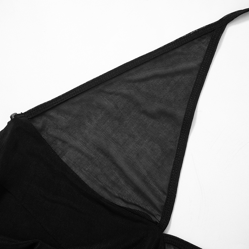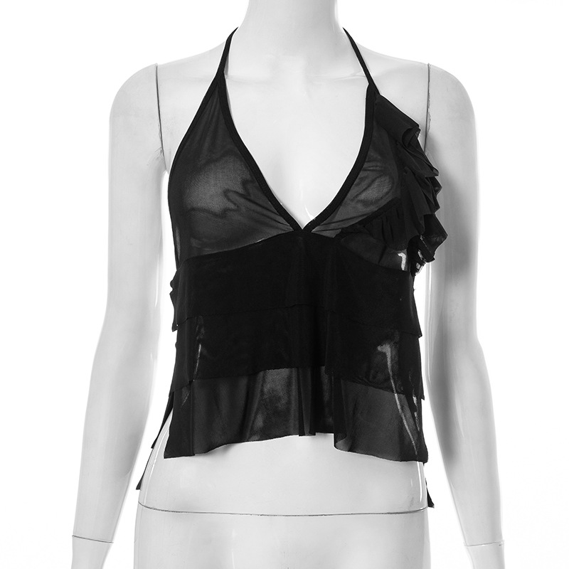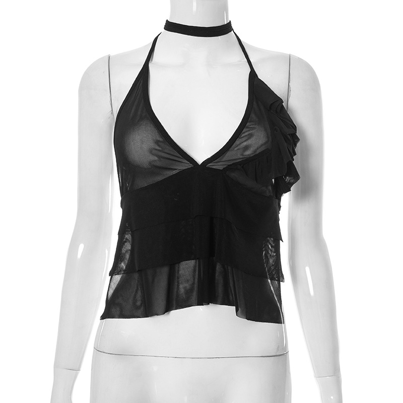 Black Mesh Halter Lace Up Wooden Ear Short Top