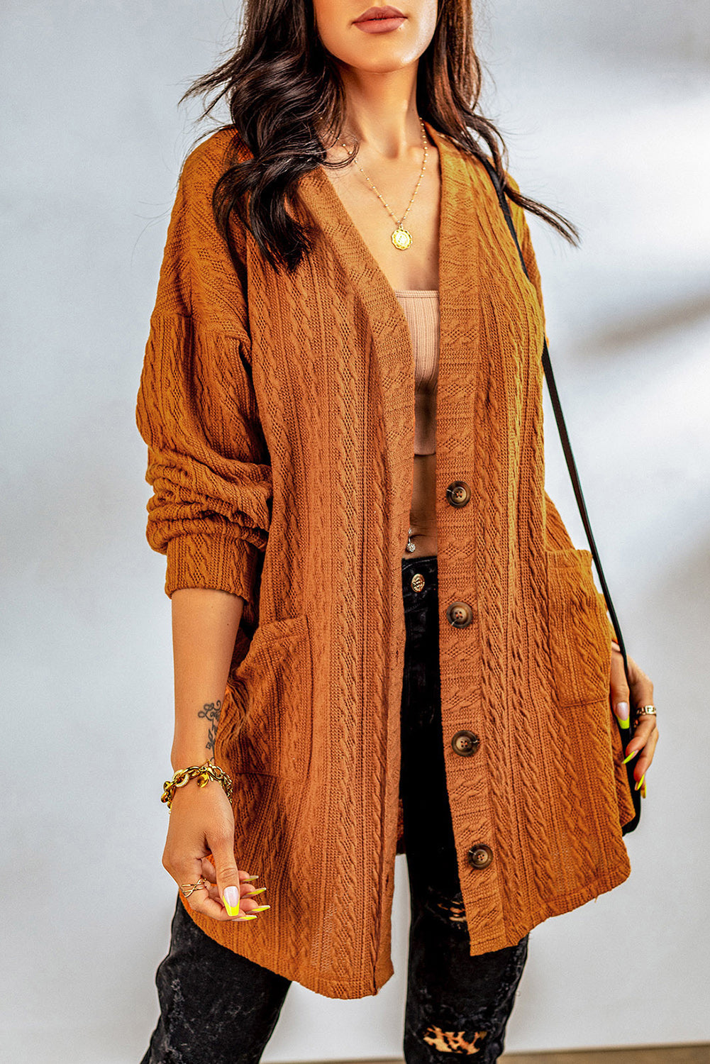M: bust 43 in. shoulder 25 in. sleeve length 19 in. length 32 in. hem width 46 in